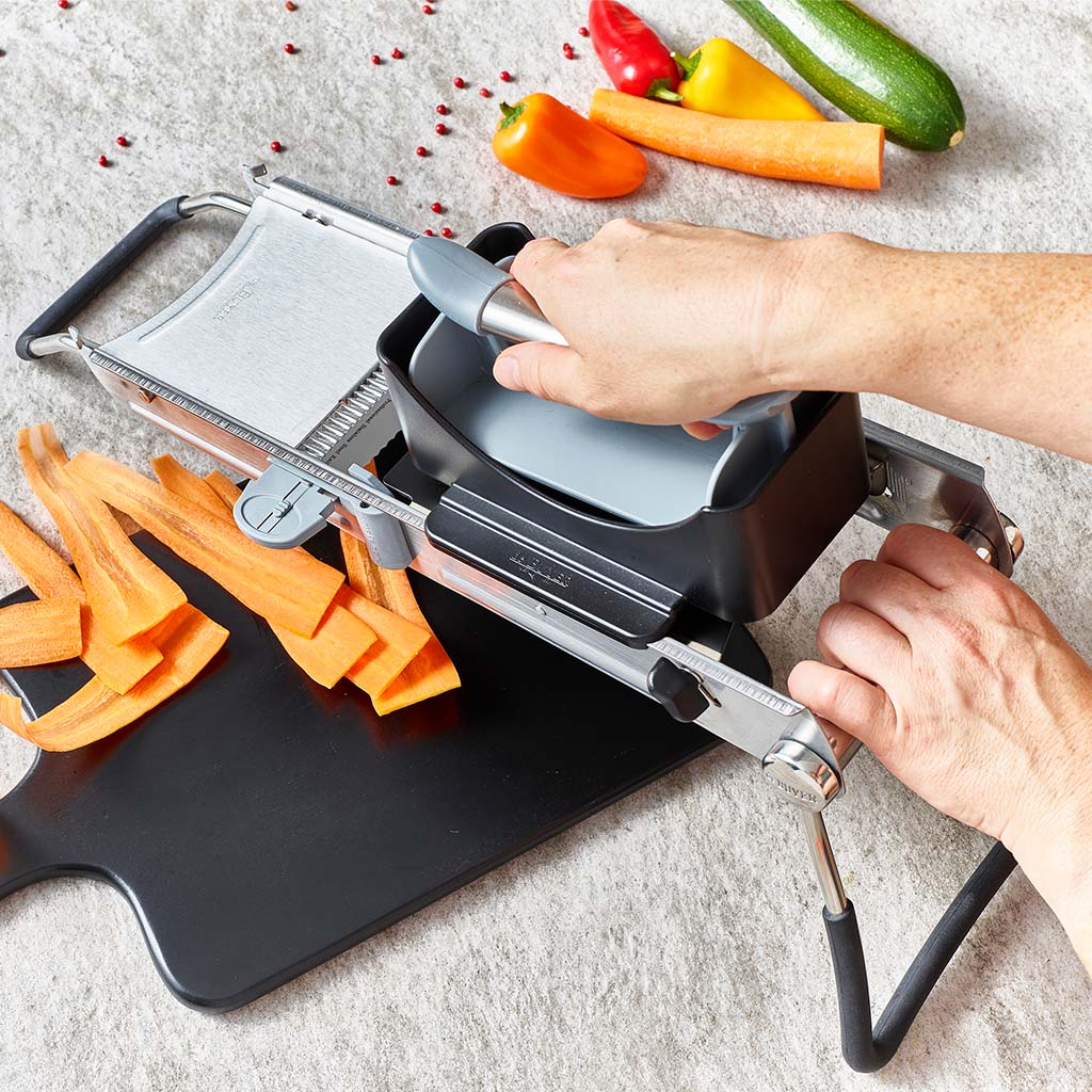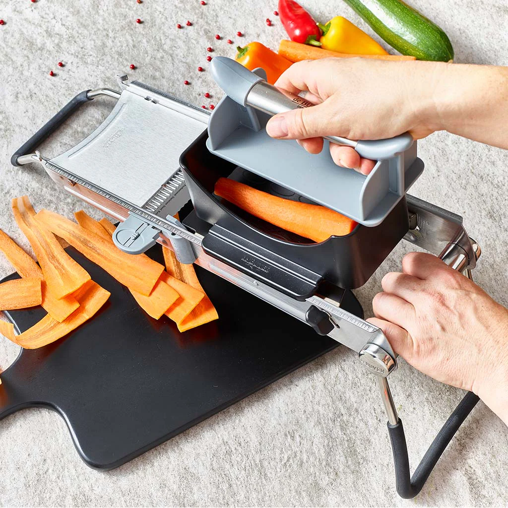 Puedes elegir entre el accesorio para mandolina Vantage o el accesorio para mandolina Revolution y Ultra, según el modelo de tu mandolina, para complementarla y obtener cortes a lo largo muy precisos, perfectos para sorprender en tus recetas. Totalmente seguro gracias al asa de su parte superior, permite deslizar el accesorio para rebanar el alimento sin tener que tocarlo.
