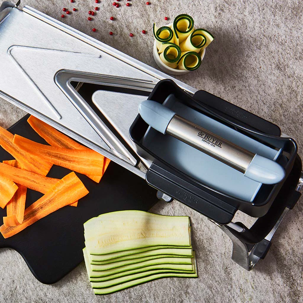 El Accesorio para mandolina extra largo De Buyer te va a permitir cortar las frutas y verduras en láminas o bastones extra largos, de una forma fácil y muy segura, en las mandolinas Vantage, la Revolution y la mandolina Ultra, todas de De Buyer.