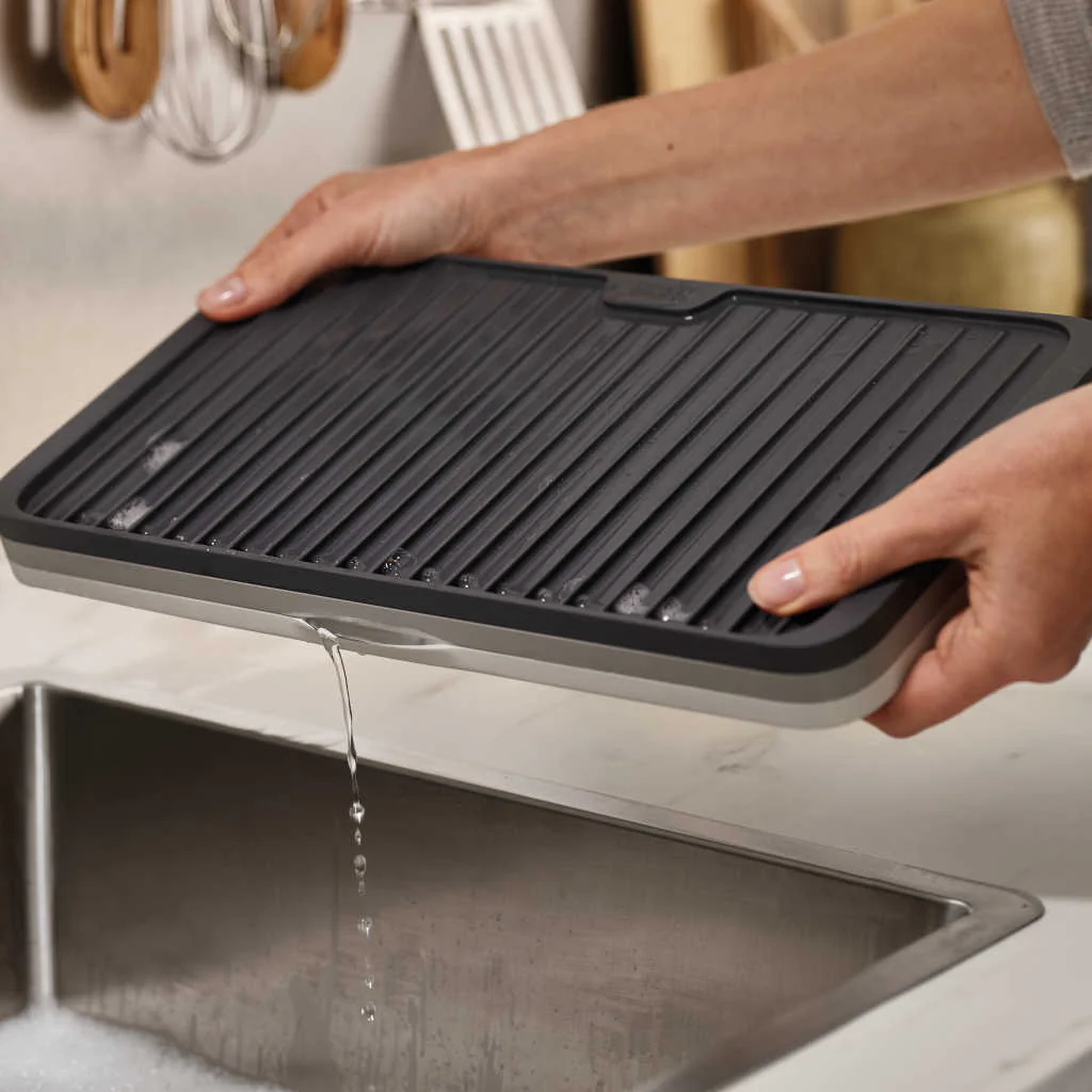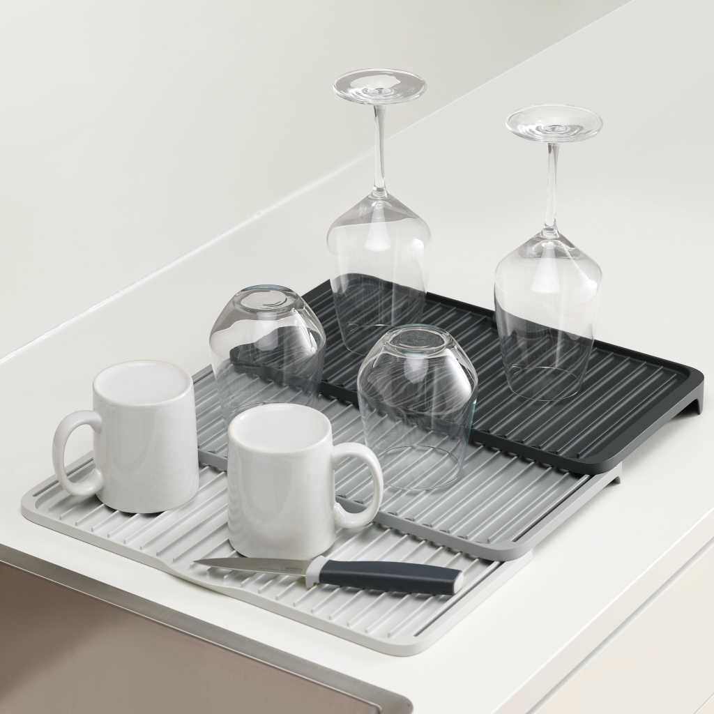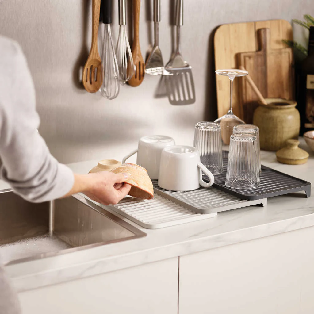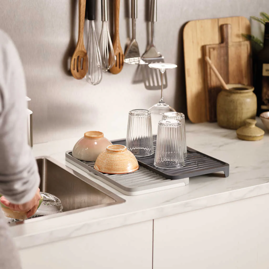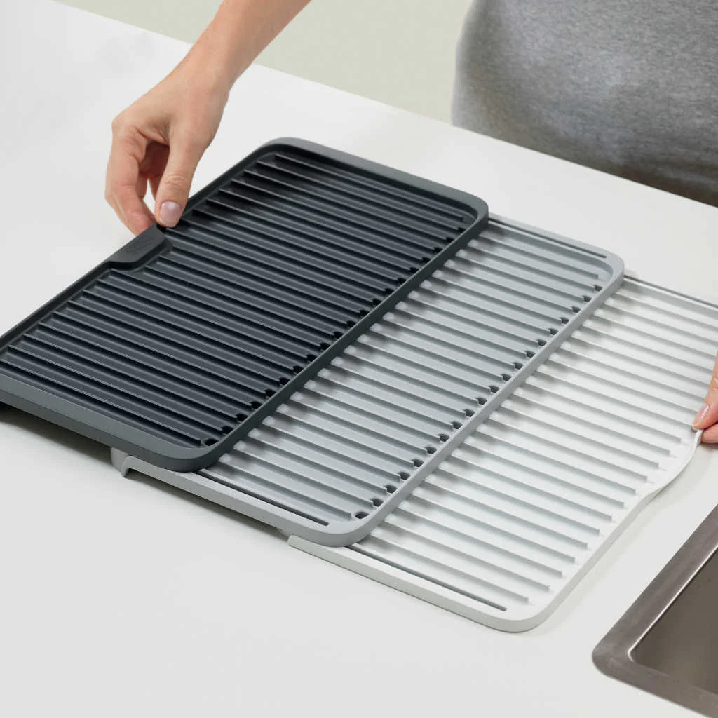 La Alfombrilla escurreplatos expandible Tier Joseph Joseph es una práctica tabla extensible con canaletas para drenar el agua, perfecta para escurrir vasos, cazos, sartenes, tazas, ¡o cualquier utensilio de cocina! Puedes usarla sin desplegar cuando necesites poca superficie para escurrir, o extender sus tres niveles para lograr una alfombrilla de más del doble de su tamaño, perfecta cuando hay que fregar más vasos.