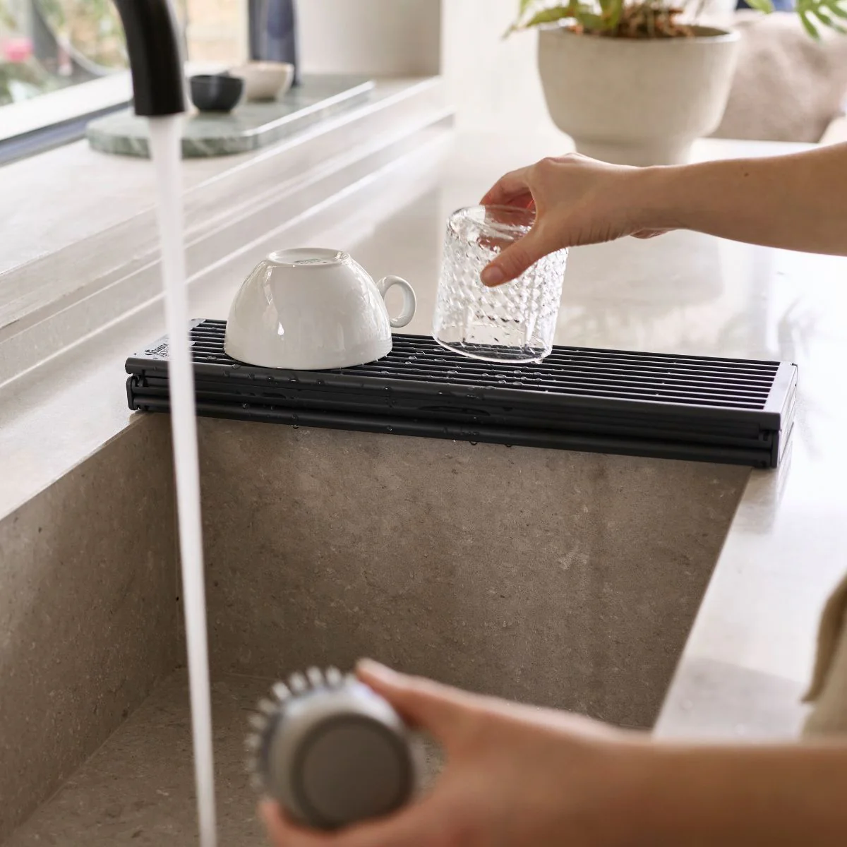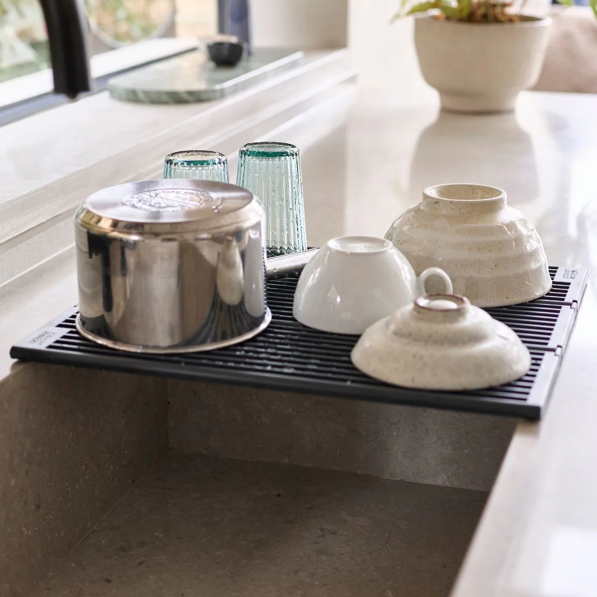 Resistente y versátil, se adapta a cualquier cocina y te ofrece el espacio que necesitas para escurrir desde platos y vasos hasta ollas, cazos y sartenes: puedes utilizarla totalmente desplegada cuando tienes muchas piezas que secar, aprovechando toda su superficie antideslizante. O bien plegarla parcialmente para ajustarla al espacio disponible, ideal para cocinas más pequeñas o para cuando solo necesitas secar unos pocos utensilios.