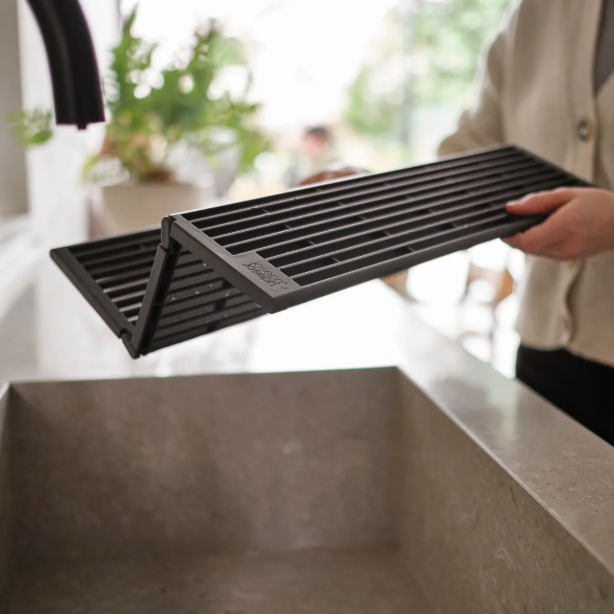 De diseño compacto y moderno, con la Alfombrilla escurreplatos plegable Joseph Joseph podrás secar toda tu vajilla y utensilios con la máxima comodidad. Su estructura flexible te permite extenderla para obtener una amplia superficie de secado o plegarla fácilmente para ahorrar espacio cuando no la estés usando. ¡Un imprescindible para cualquier cocina!