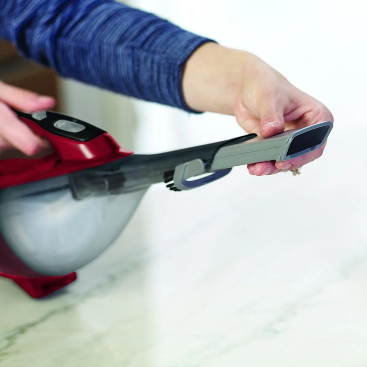 El depósito del aspirador de mano inalámbrico Dustbuster 10,8 V de Black&Decker tiene una capacidad de 500ml, de modo que no requiere ser vaciado constantemente mientras se está limpiando. Además, gracias a la translucidez del vaso se puede ver cuándo es necesario vaciarlo sin necesidad de abrirlo.