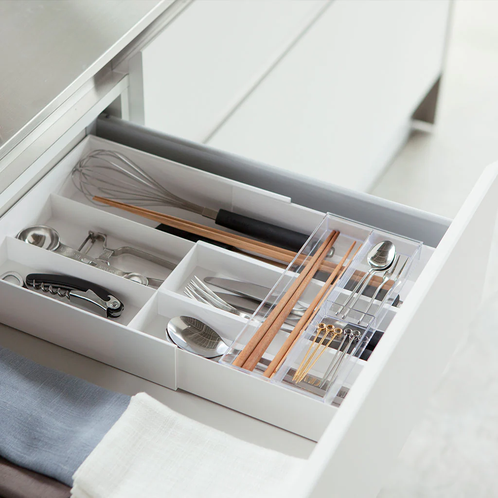 La Bandeja para cubiertos extensible Yamazaki es la solución perfecta para recuperar el orden en tu cocina. Esta práctica bandeja organizadora se expande para adaptarse a cajones de todos los tamaños. Dividida en distintos compartimentos, hará que todo esté en su lugar y puedas mantener tu espacio siempre ordenado. Además, es muy versátil y podrás utilizarla para guardar desde utensilios de cocina, hasta lápices de colores, joyas, bisutería ¡y mucho más!