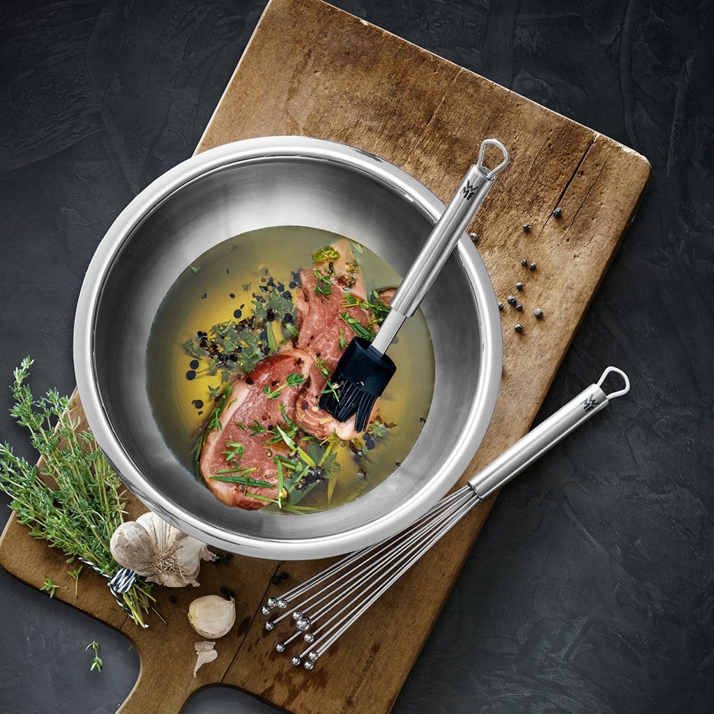 El Batidor con punta de bolas de acero inoxidable WMF Profi Plus es el utensilio perfecto para emulsionar salsas, remover cremas y masas ligeras evitando que se formen grumos, y para batir sin incorporar aire a las mezclas. Además, gracias a su diseño, llega a todos los rincones de tus boles, ollas o cazuelas.