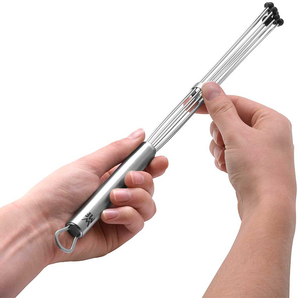 Como el batidor más popular de WMF, ¡Pero sin ocupar espacio! El Batidor con punta de bolas y anillo deslizante de WMF es el utensilio perfecto para emulsionar salsas, remover cremas y masas ligeras evitando que se formen grumos, y batir sin incorporar aire a las mezclas. Su diseño le permite llegar a todos los rincones de tus cazuelas y boles, y gracias a su anillo integrado podrás guardarlo ocupando muy poco espacio.