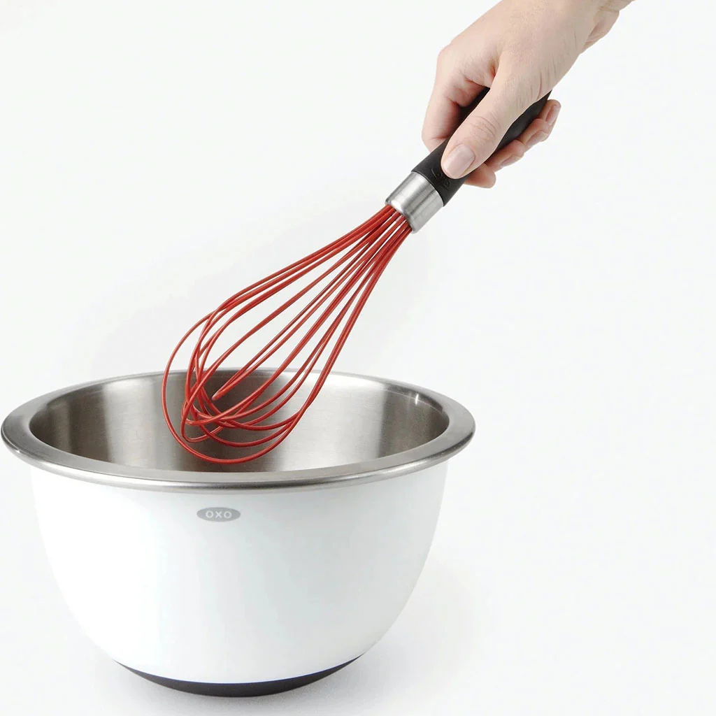 El Batidor de varillas tipo globo de silicona OXO es la herramienta perfecta para mezclar todo tipo de ingredientes con máxima facilidad y comodidad. Diseñado con acero inoxidable y silicona de calidad, cuenta con un mango de goma que proporciona un agarre firme y cómodo durante su uso.