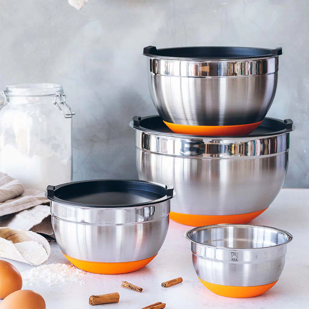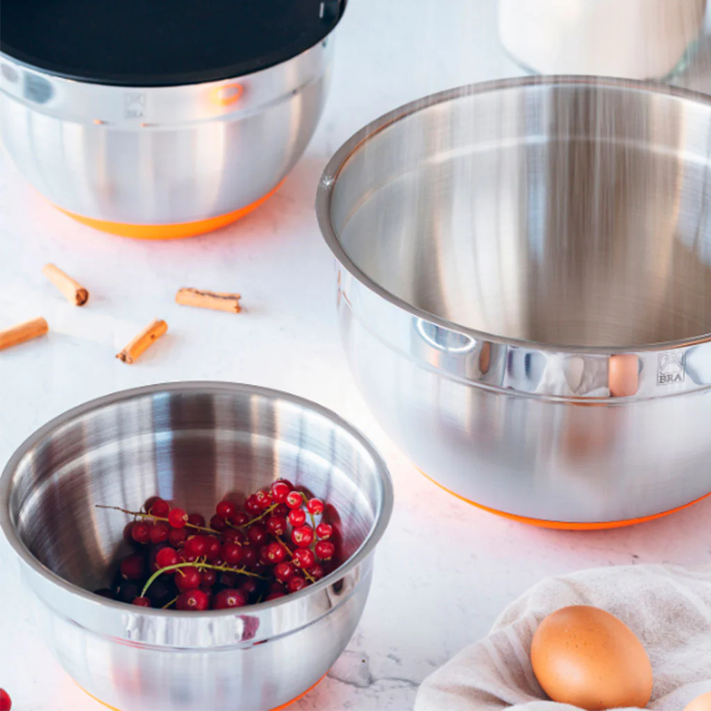 El Bol de acero inoxidable Efficient de Bra es un imprescindible en tu cocina. Este cuenco con tapa y base de silicona es un recipiente ideal para preparar, servir y conservar la comida tapada y en perfecto estado durante más tiempo. Tanto si eliges una sola medida, como si prefieres un set con varios tamaños, ¡acertarás!
