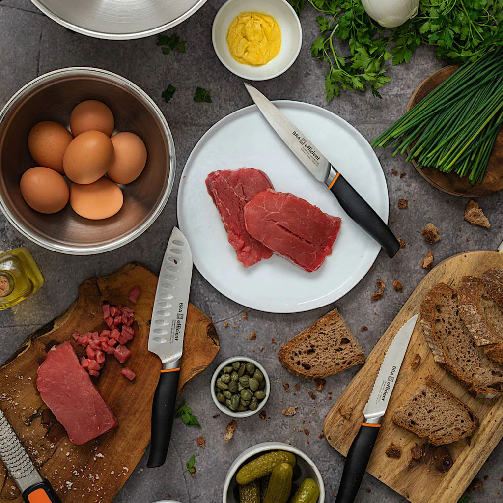 La base antideslizante de silicona naranja, el color de la colección Efficient que es la más icónica de Bra, te ayuda a manejarlos con comodidad, ya que evita que se mueva mientras mezclas, aportándole estabilidad.