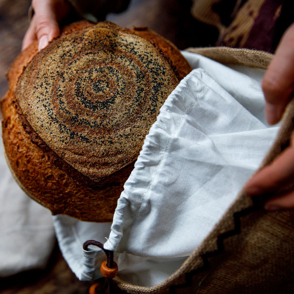 Cuenta con una capa exterior hecha de yute, un material de rápido crecimiento, y un forro interior 100% de algodón. Juntos permiten que el pan respire, evitando la acumulación de humedad y la formación de condensación. Además, la bolsa ayuda a prevenir que el pan se seque rápidamente.