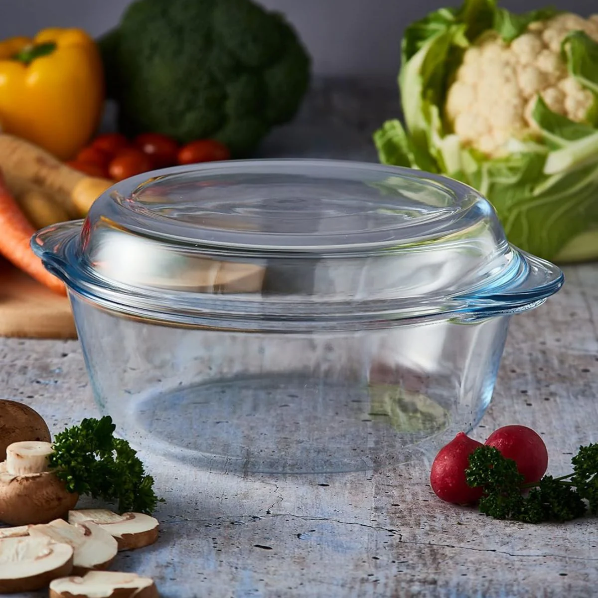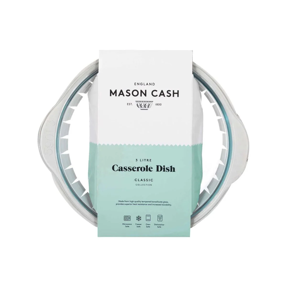 - Cacerola de cristal con tapa Mason Cash.
