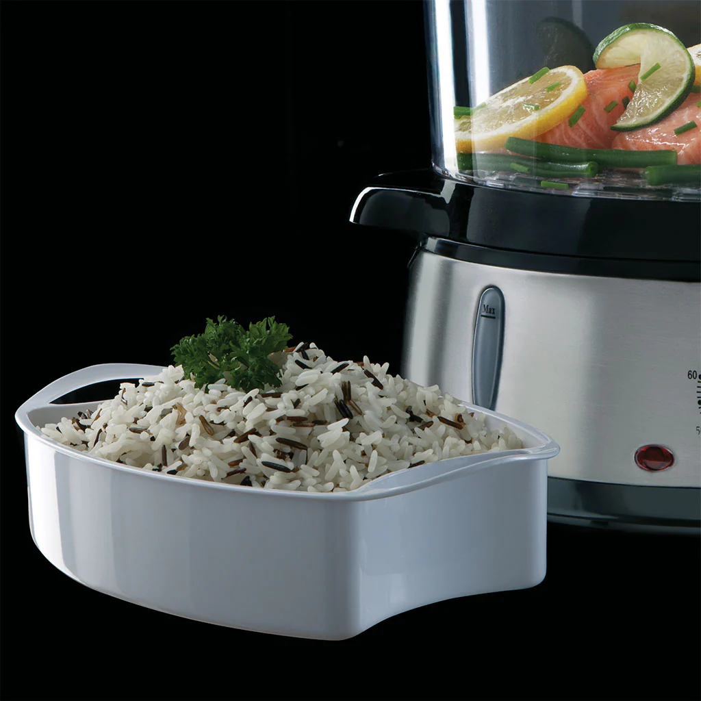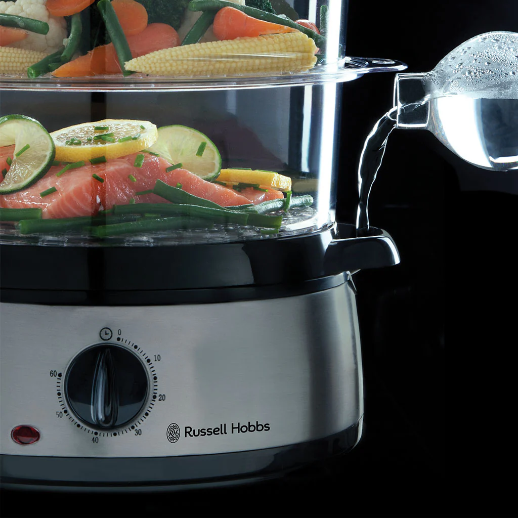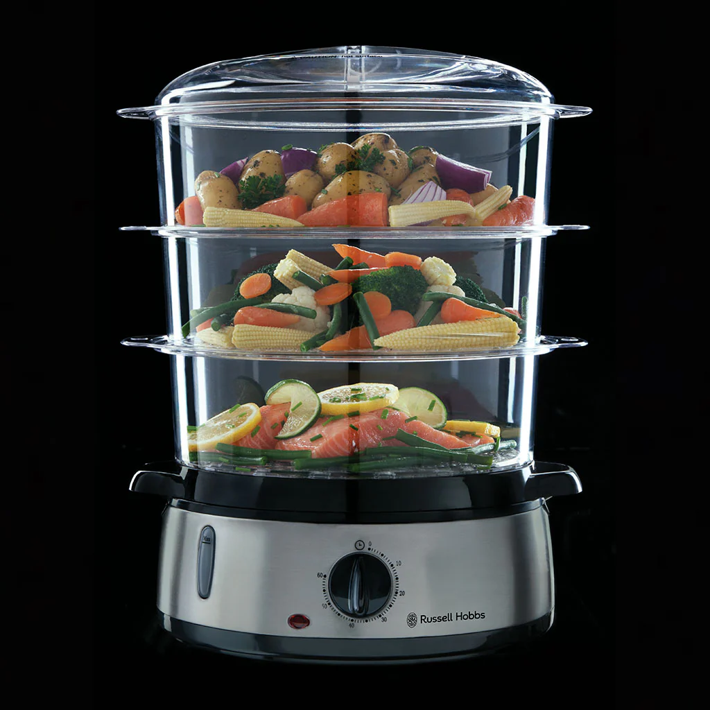 ¡Disfruta de una cocina saludable con la vaporera Russell Hobbs! Esta maravilla cuenta con tres recipientes apilables con los que podrás cocinar al vapor y al mismo tiempo diferentes tipos de alimentos: arroz, verduras, pescado ¡y muchos más! Con ella, podrás preparar platos elaborados y saludables sin perder tiempo y conservando al máximo los nutrientes y las vitaminas de los ingredientes.