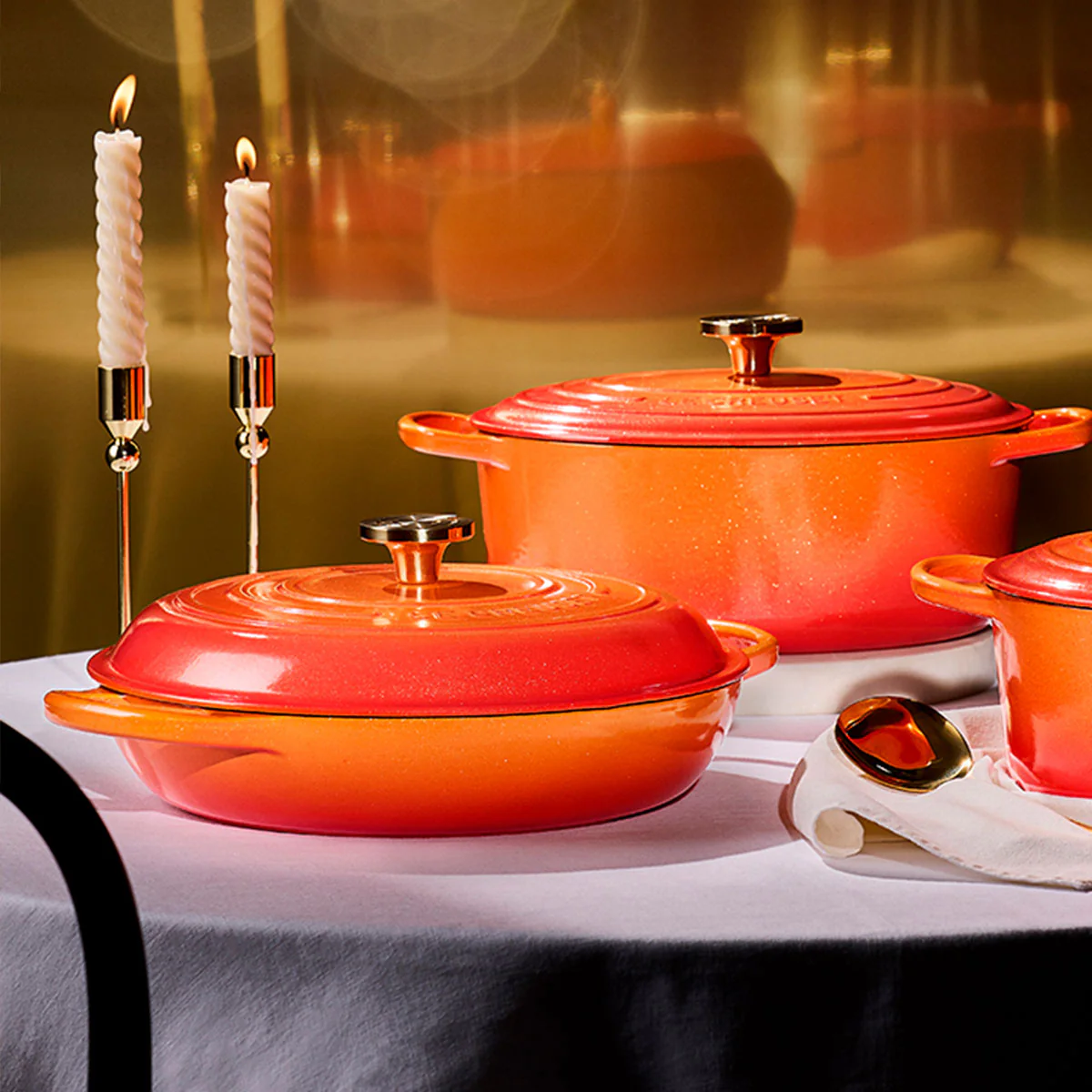 Inspirada en sus orígenes ardientes, y con todo el brillo del Centenario, el color volcánico de la primera cocotte de hierro fundido de Le Creuset, se transforma en el elegante Flame Dorée, para conmemorar los 100 años de la marca, en una Edición Especial Limitada del 100 aniversario de Le Creuset. La combinación del vibrante acabado con partículas de oro con el exclusivo pomo Crisol, hace de esta cocotte baja tipo cacerola premium todo un símbolo de estilo, de pasión culinaria y de «joie de vivre».