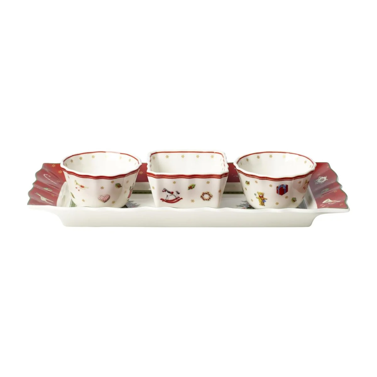 Este Conjunto de 4 piezas de porcelana para salsas y aperitivos Toy’s Delight Villeroy & Boch, ¡no puede ser más bonito! Tan elegante como funcional, este juego incluye tres cuencos y una bandeja formando un set perfecto que lucirá precioso en tu mesa y usarás para todo. Fabricadas en Europa, con un precioso diseño y sus encantadores motivos navideños inspirados en juguetes clásicos, estas 4 piezas de porcelana prémium de gran durabilidad, llevarán la magia de la Navidad allí donde las coloques.
