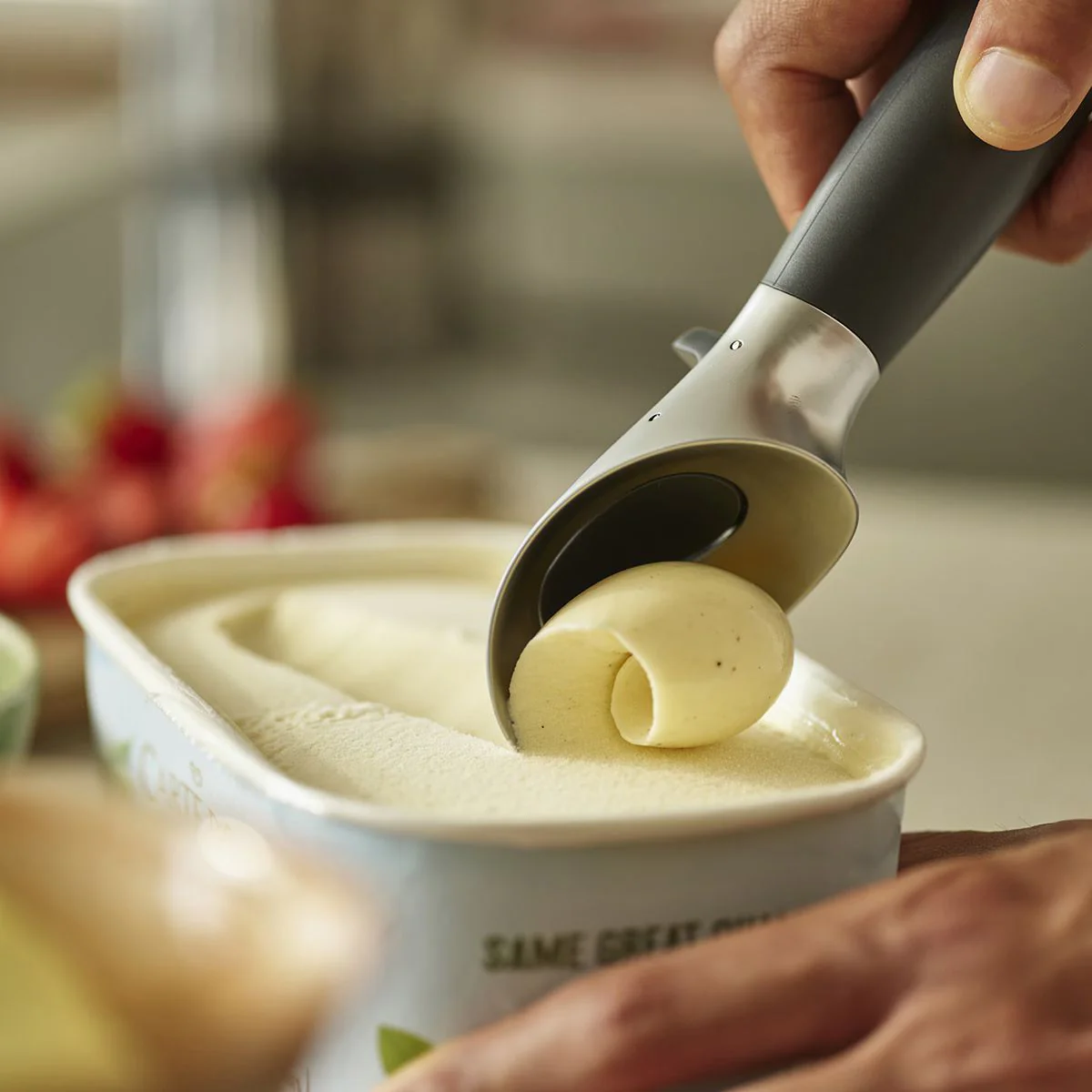 2. Su práctico sistema de clic facilita sujetar y servir la bola en cualquier recipiente con total comodidad.