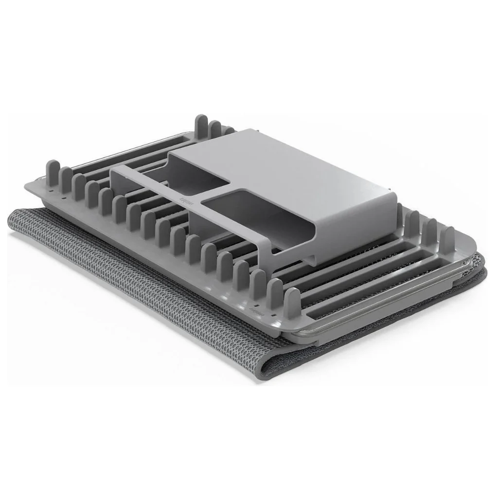 De aspecto minimalista, el Escurreplatos 2 en 1 UDry de Umbra es tan elegante como práctico. Provisto de alfombrilla absorbente, cestillo extraíble para los cubiertos y bandeja escurreplatos con 16 ranuras extraíble y extensible, que puedes dejar sobre el tapete de secado o llevar al fregadero, sea cual sea su tamaño. ¡De lo más útil!