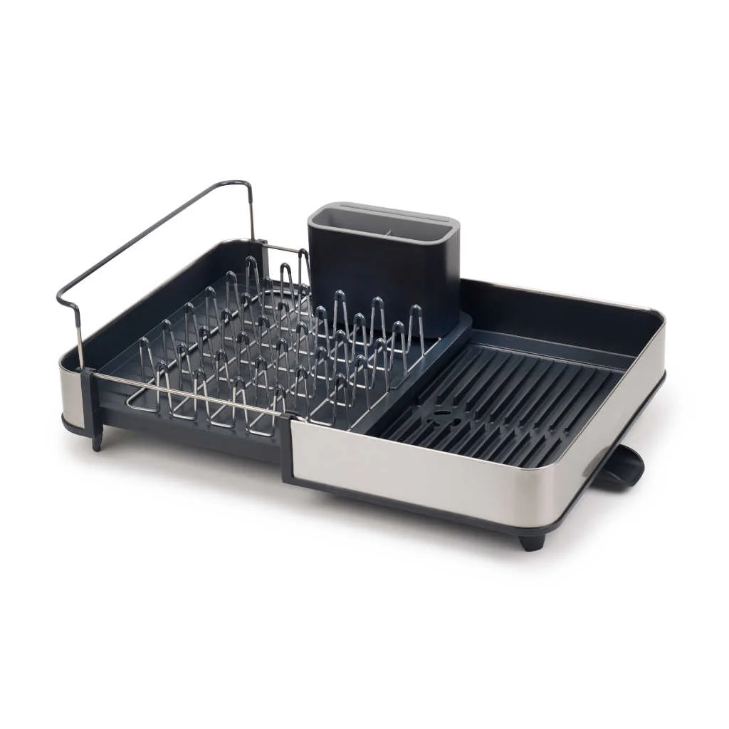 El Escurreplatos de acero Joseph Joseph es una estupenda bandeja extensible con la que ganarás espacio para escurrir los platos, vasos, cubiertos y demás utensilios que laves a mano, incluso tablas de madera o piezas más grandes, que quedarán bien sujetas gracias a la barra elevada de acero inoxidable. El ingenioso diseño de esta bandeja de dos piezas te permite ajustar el tamaño del escurridor al del espacio que tengas en la encimera, según necesites.