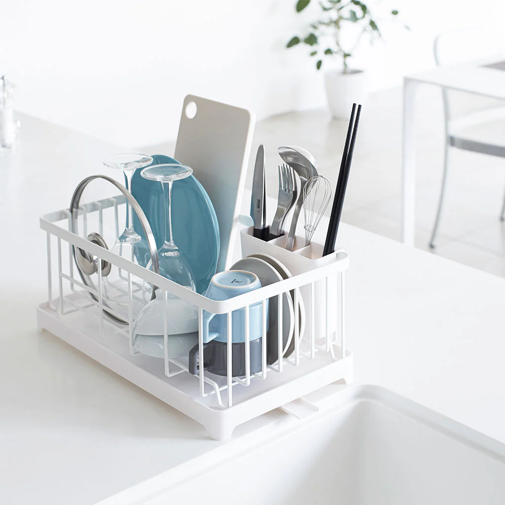 Con unas medidas compactas, este escurridor ofrece suficiente espacio para todo, desde platos y cuencos hasta utensilios y vasos, pero ocupando el mínimo espacio. Además, su soporte para cubiertos es extraíble y puedes colgarlo en cualquier parte del estante, lo que lo hace muy práctico.