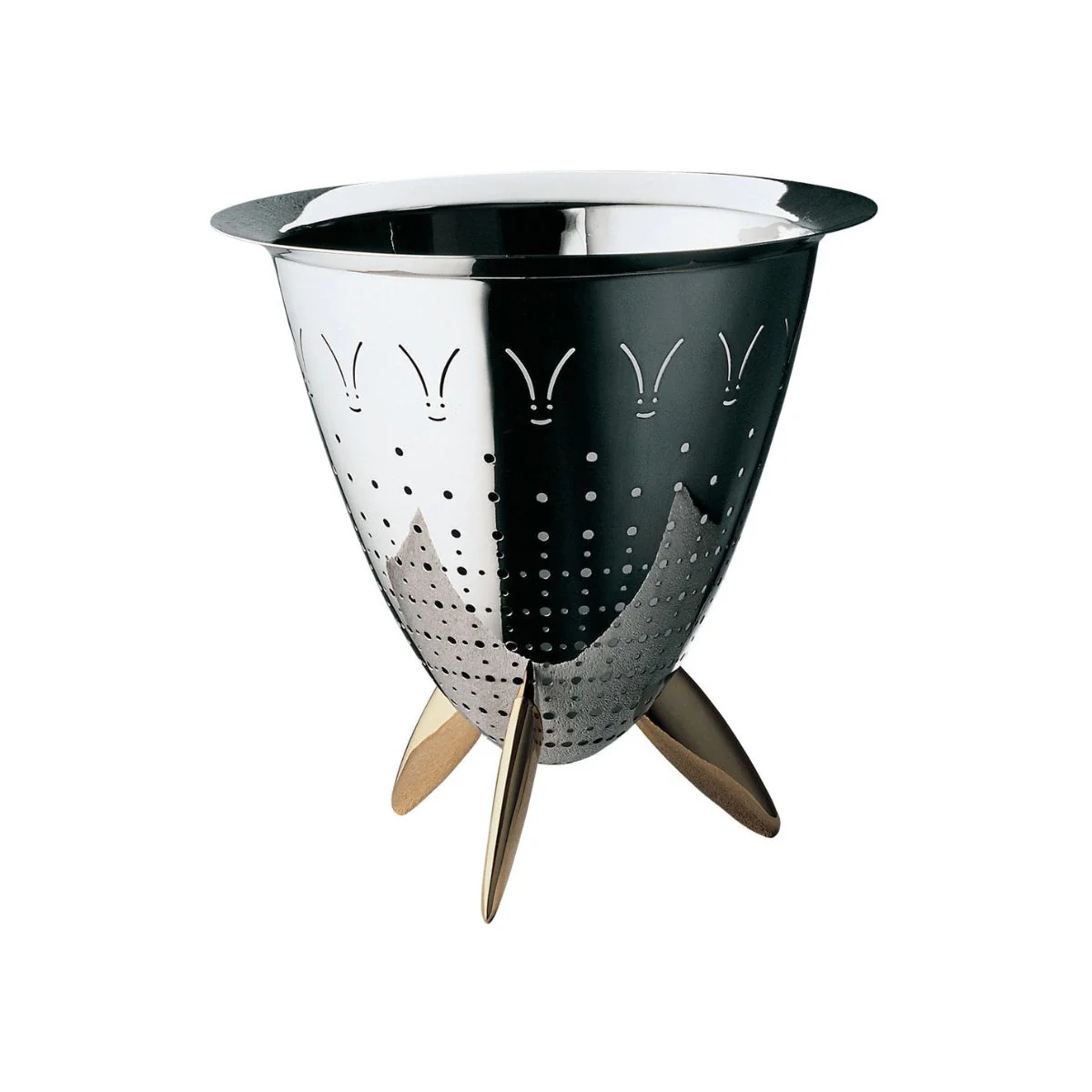 ¿Alguna vez te faltaron manos a la hora de escurrir la pasta o las verduras porque no podías sujetar al mismo tiempo el escurridor y la olla? Con este escurridor en acero inoxidable Max Le Chinois Philippe Starck Alessi esto no te volverá a pasar más. Este colador ¡cuenta con unos fabulosos pies de latón que le permiten sostenerse solo!
