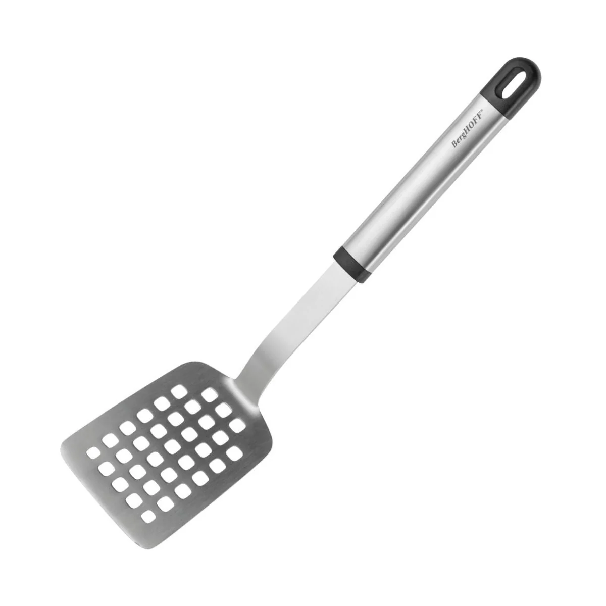 ¿Qué utilizas para voltear los alimentos mientras se están cociendo en la sartén? Cuando llega el momento de sacarlos de la sartén y emplatarlos, ¿cómo lo haces para escurrir el aceita sobrante y evitar que quede en el plato? Con la espátula de cocina Berghoff podrás voltear los alimentos cómodamente, sacarlos de la sartén y también escurrirlos antes de colocarlos en el plato. ¡Esta espátula sirve para todo!