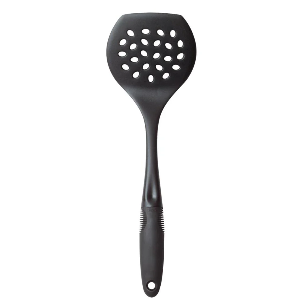 La amplia pala de la Espumadera redonda de nylon OXO es una ayuda estupenda para girar o servir desde hamburguesas a huevos fritos, rodajas de pescado o tortitas. La para cuenta con perforaciones para escurrir los jugos, eliminando de forma cómoda el exceso de líquido al servir los alimentos. Al estar fabricada en nailon es una ayudante de lujo para usar con todos tus utensilios, incluso los antiadherentes, sin peligro de que los dañe.