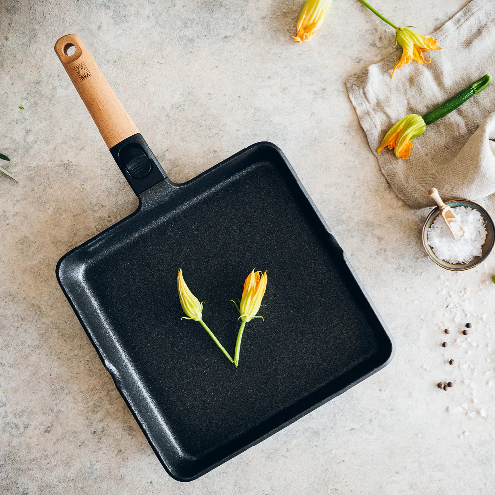 • Grill liso antiadherente y mango de madera desmontable Market de BRA.