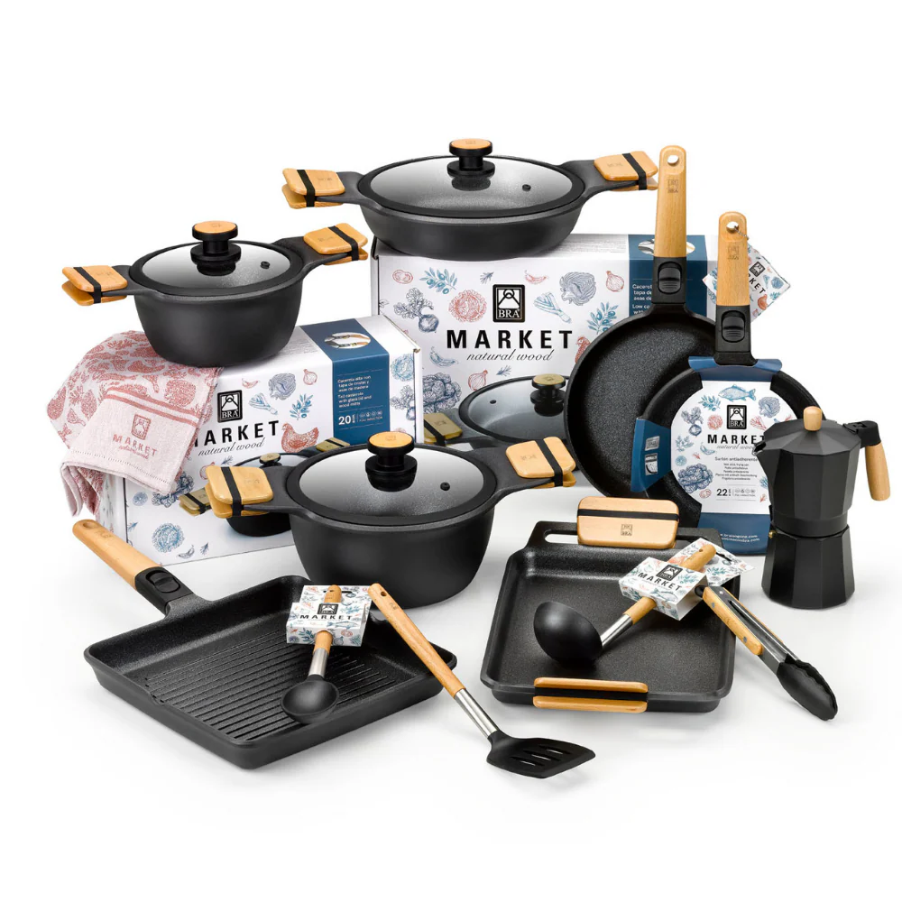 Sabemos que la colección Market enamora por su elegancia, delicadeza y ese toque de madera irresistiblemente sofisticado. El Grill liso antiadherente con mango de madera desmontable Market de BRA también te encantará. Aparte de ser un grill bonito ha sido diseñado para ofrecer unos excelentes resultados de cocción y para soportar un uso intensivo en las cocinas más exigentes.
