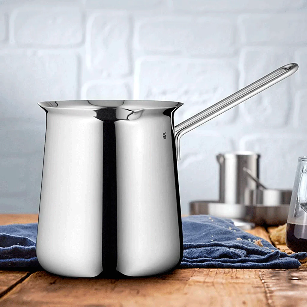 La Jarra para moca WMF es un elegante cazo, perfecto para calentar la leche y hacer la espuma para el café. En cualquiera de sus dos medidas te permite también su utilización para calentar agua o preparar salsas. ¡Pequeña, pero ideal para esas cantidades de líquido que requieres calentar rápidamente en el día a día!