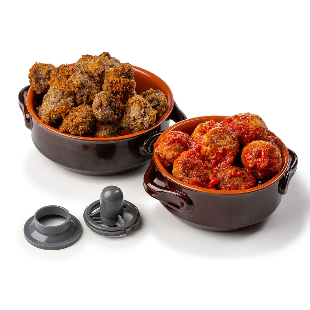 Y, finalmente, un accesorio de pulpa con el que conseguirás zumos, purés y salsas perfectas, ya que te ayudará a obtener una extracción perfecta de los líquidos reteniendo toda la pulpa, así como un accesorio de kébbe que te facilitará la preparación de esta tradicional receta oriental basada en cilindros rellenos de carne, y todo tipo de elaboraciones con relleno.