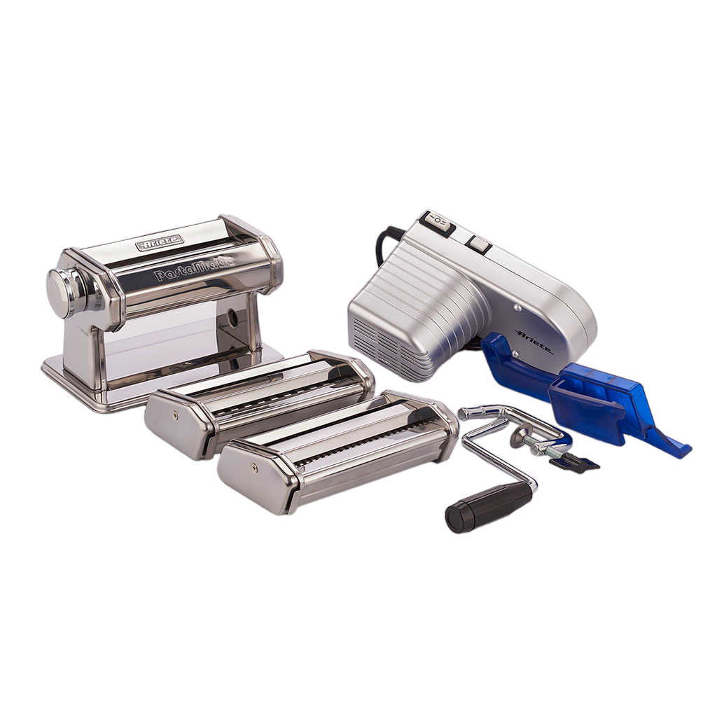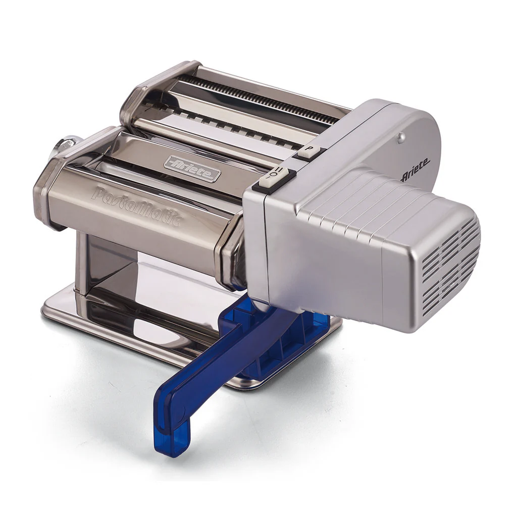 Con la Máquina automática prepara pasta fresca Pastamatic Ariete podrás hacer tu pasta fresca favorita con todo su sabor y sin ningún esfuerzo. Esta máquina eléctrica de acero inoxidable para pasta te permite cambiar la manivela por un motor de 70 W para estirar y cortar la masa automáticamente. Tan solo has de elegir el grosor de las láminas de pasta entre sus 9 opciones y tendrás listas tus placas de lasaña o de canelones, los tallarines o los fettuccini sin despeinarte. ¡Mamma mia!