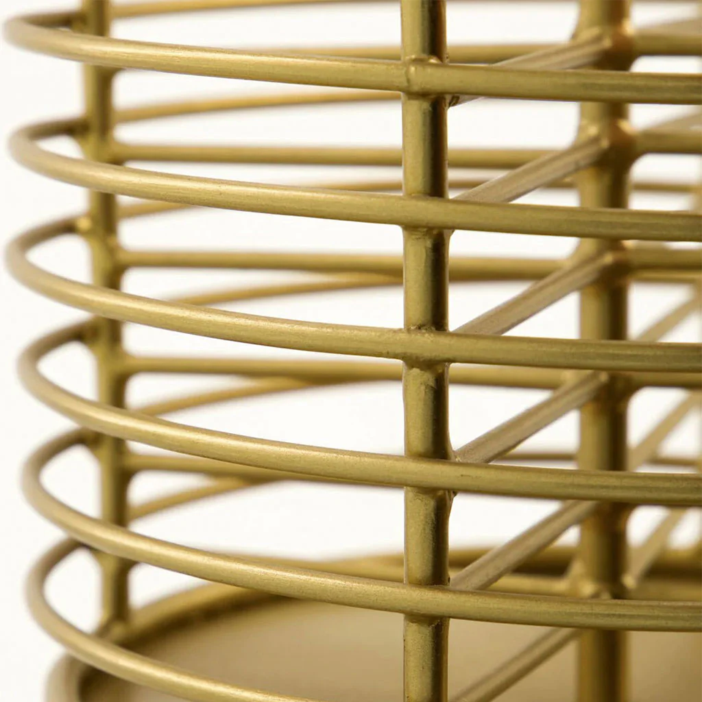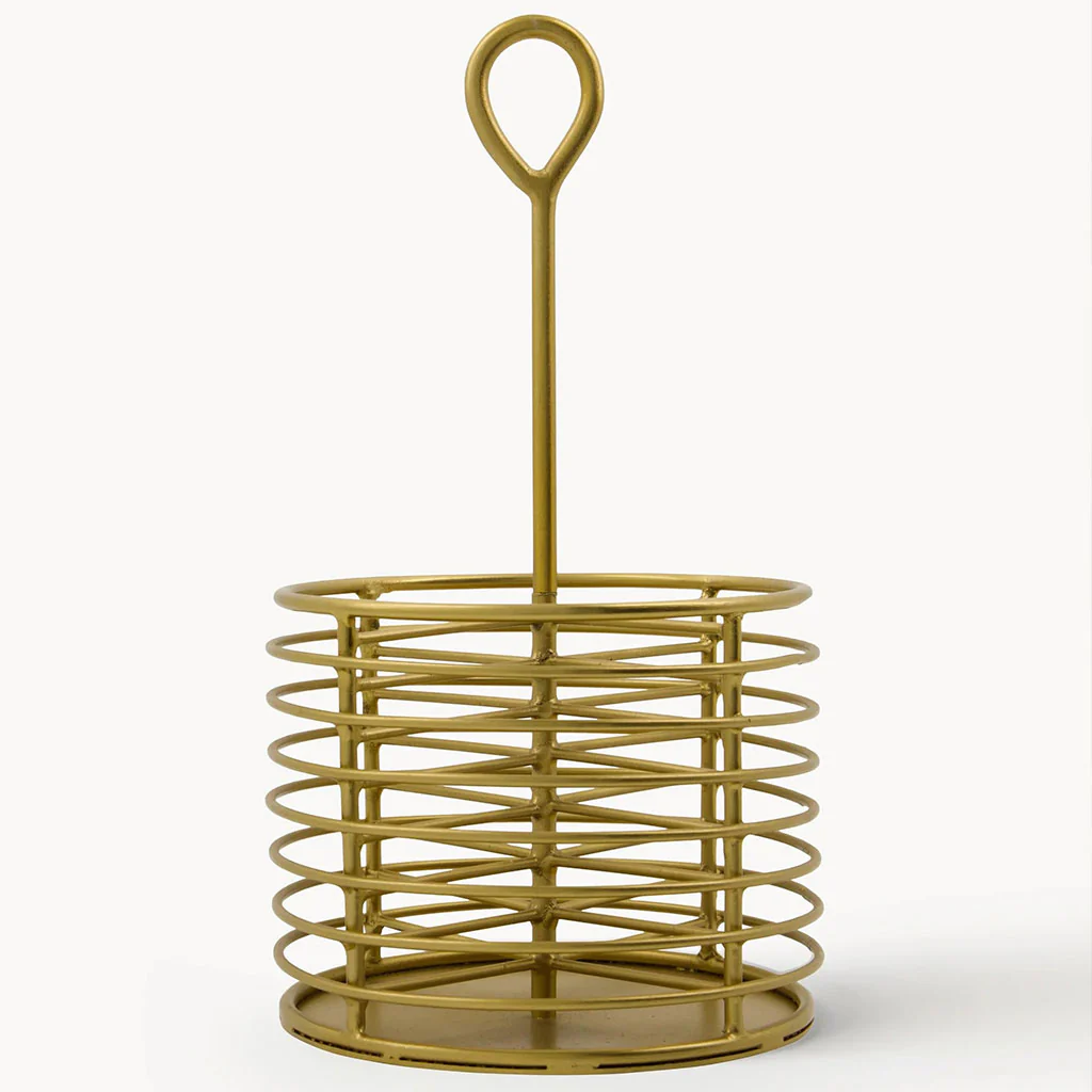 Fabricado en hierro con un acabado en latón antiguo, este organizador destaca por su diseño refinado y versátil. Cuenta con cuatro compartimentos espaciosos y un asa central que lo hace muy cómodo al agarre, convirtiéndolo en una herramienta práctica para organizar todos tus cubiertos, servilletas u otros utensilios.