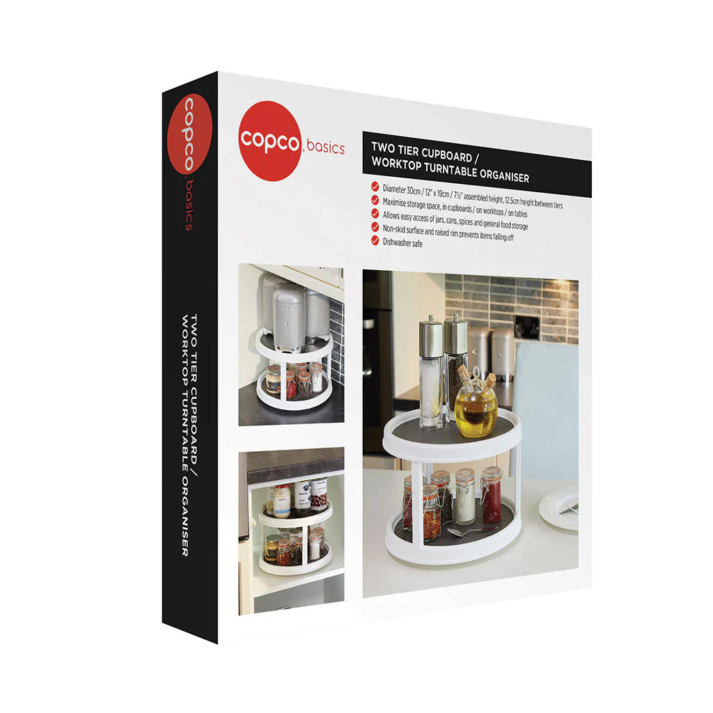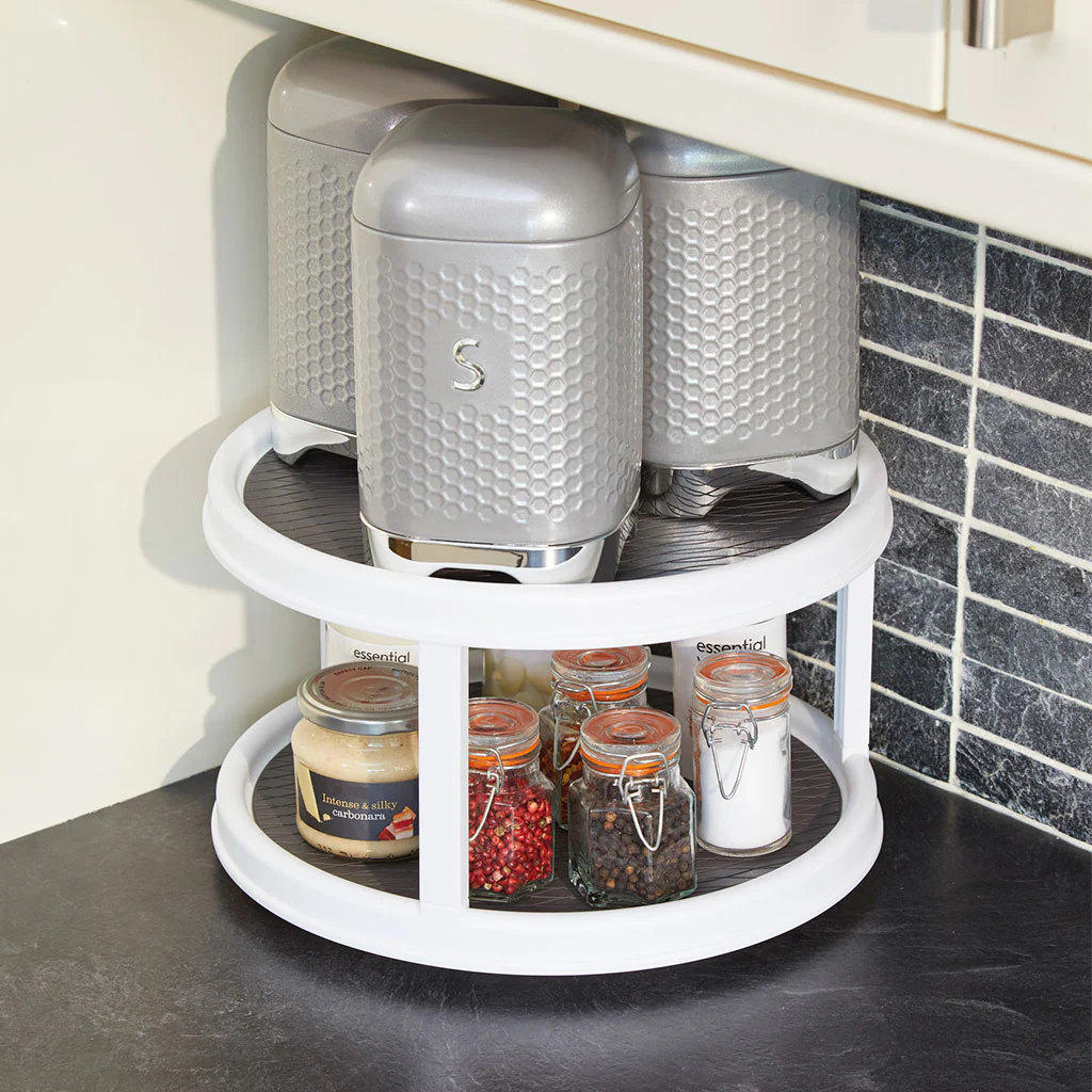 ¡Se acabó darle más vueltas a la distribución de los botes en la despensa! Con el Organizador giratorio de dos niveles KitchenCraft lo tendrás todo siempre a mano con solo girar su base. Este estante de dos pisos es perfecto para ordenar tus tarros y especias en los armarios, y es también ideal para llevar las salsas y condimentos a la mesa.