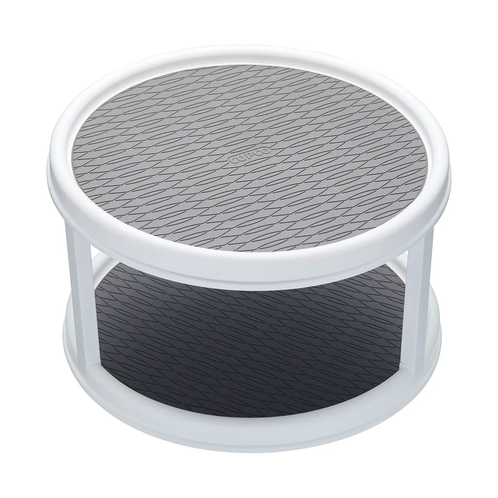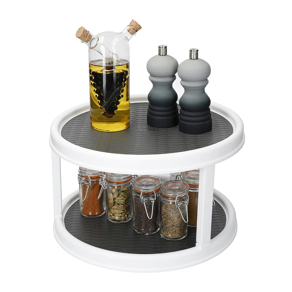 El organizador de dos alturas es una solución de lo más ingeniosa para ganar el doble de espacio en la despensa o sobre la encimera. Cada base tiene un amplio diámetro de 30 cm, para que puedas colocarlo todo. Y su superficie antideslizante evita que los botes se muevan al girarlo.