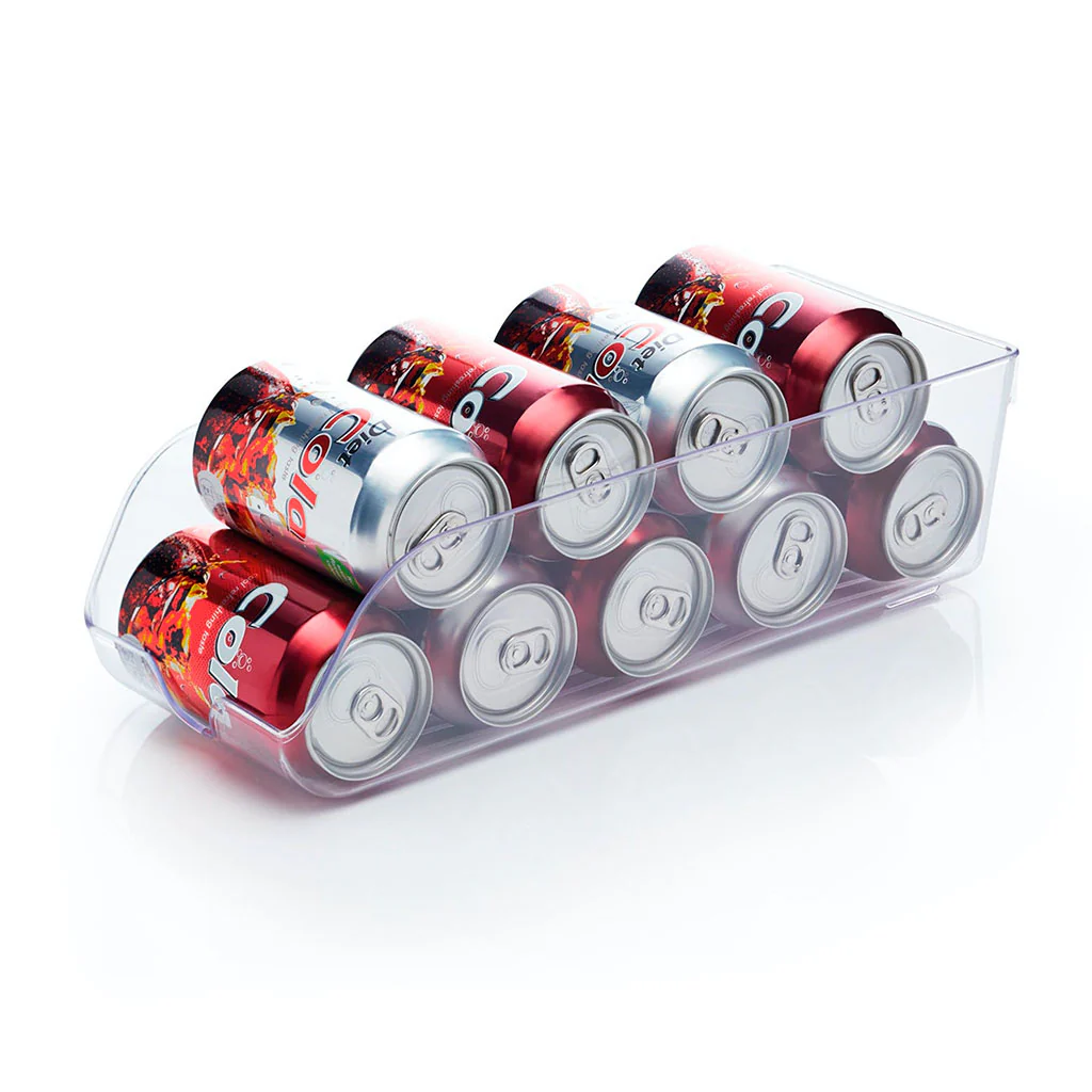 - 14 cm x 34,5 cm x 9,5 cm. Por sus medidas, este organizador es ideal para tus refrescos de lata. Gracias a su diseño con una leve inclinación hacia delante, cuando cojas la lata delantera, otra lata rodará para colocarse en el espacio que ha quedado libre.