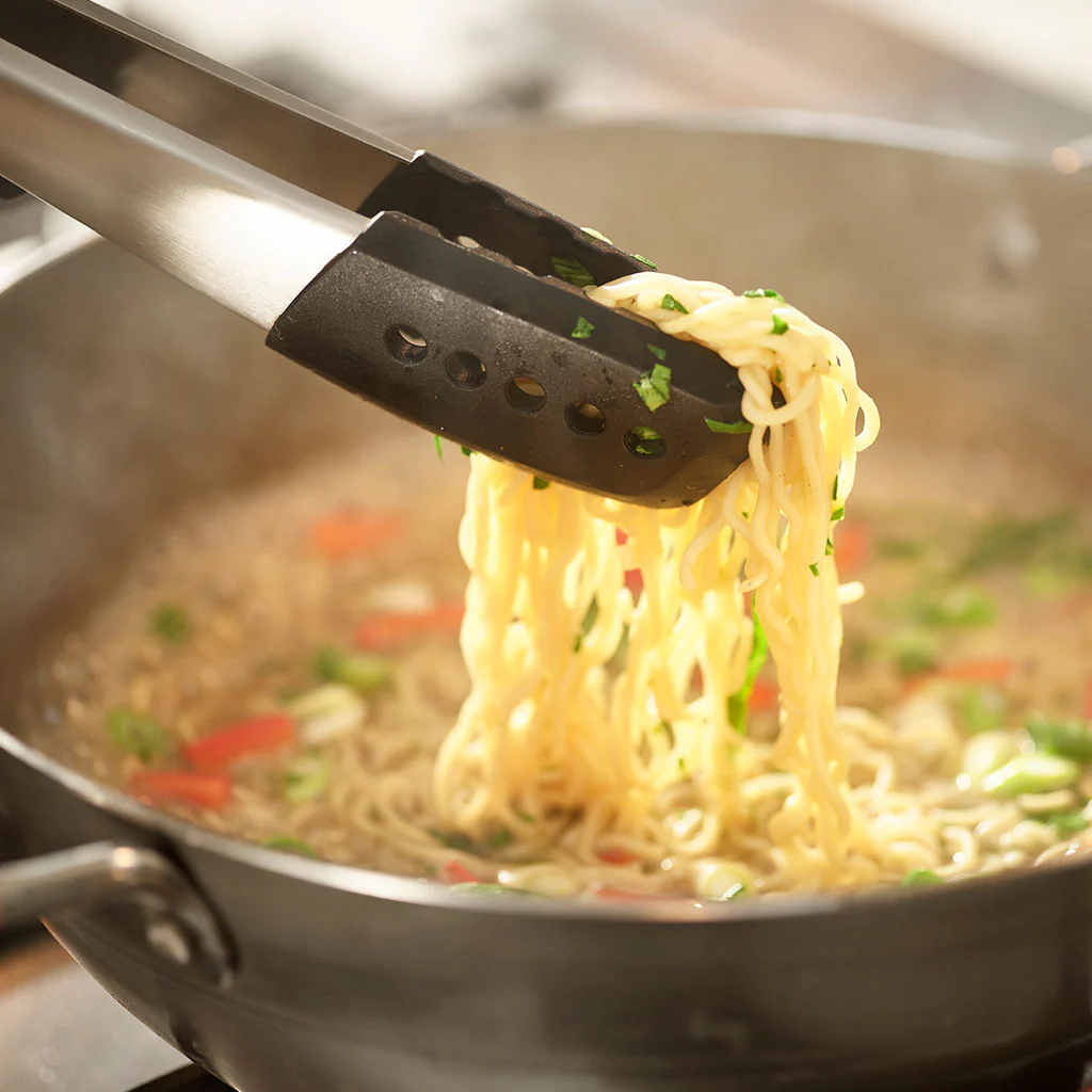 - Set de dos unidades, que incluye pinzas de precisión (30,5 cm de largo) y pinzas grandes (31,2 cm de largo), con amplio cabezal perforado, ideales para coger alimentos de mucho volumen y escurrir líquido.