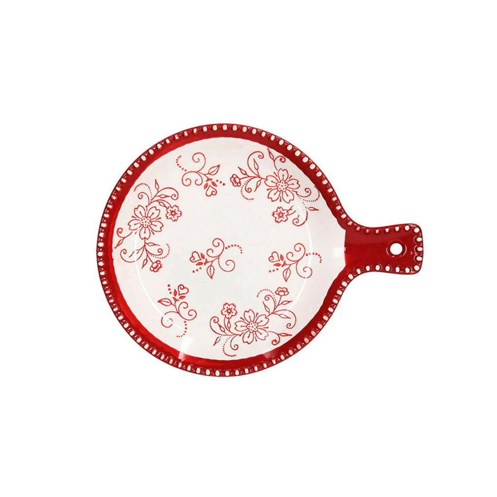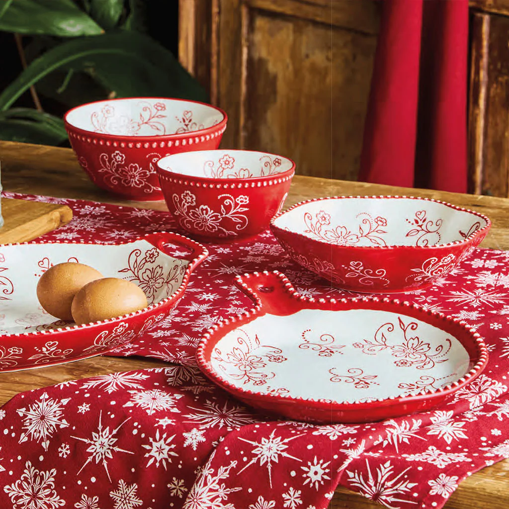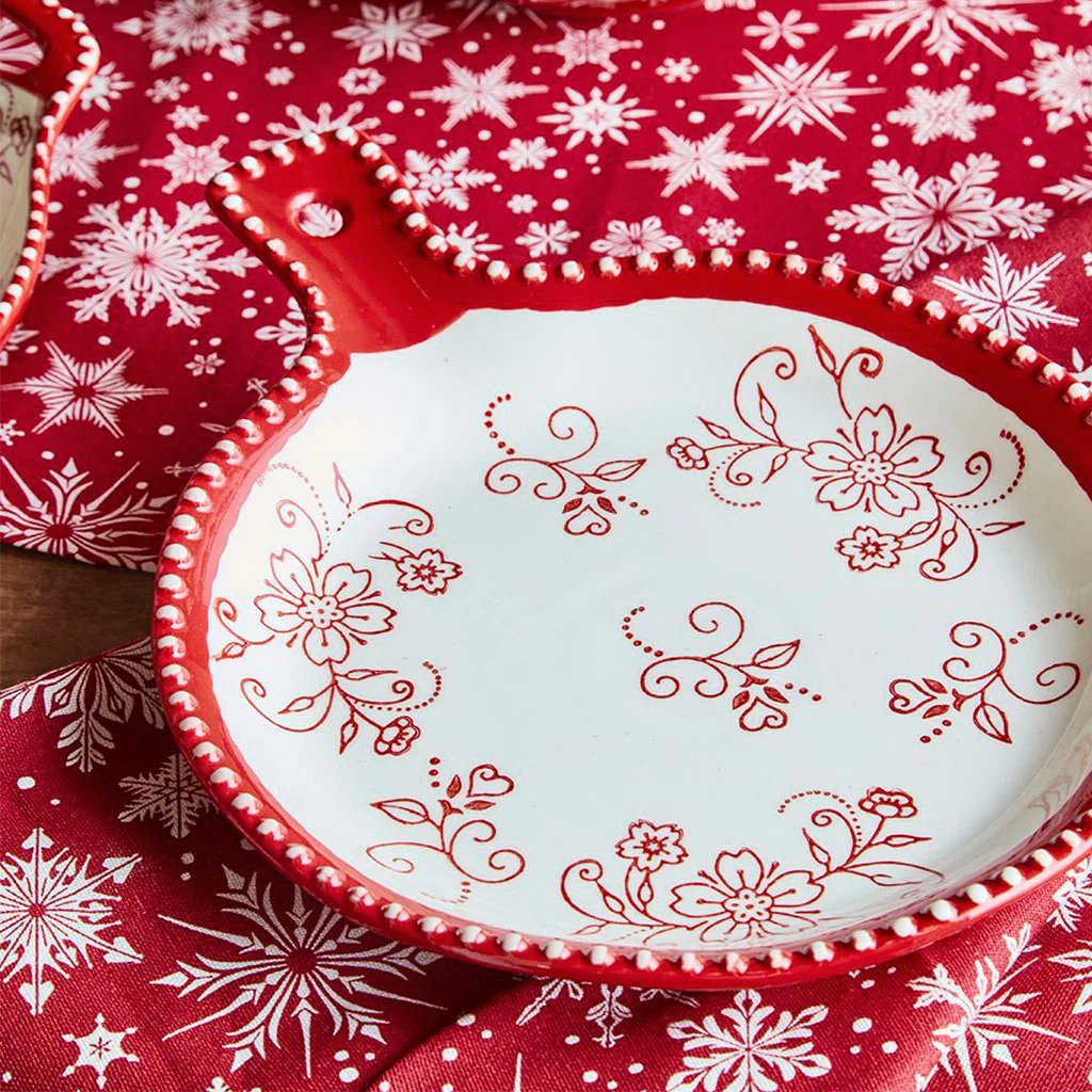 Añade un toque festivo a tu mesa navideña con este precioso Plato con asa Natalia Tognana. Esta bandeja de porcelana en tonos exteriores rojo e interior blanco, y decorado con delicados motivos florales, será la estrella de tus recetas navideñas o los encuentros familiares, aportando calidez y elegancia a cada comida especial.