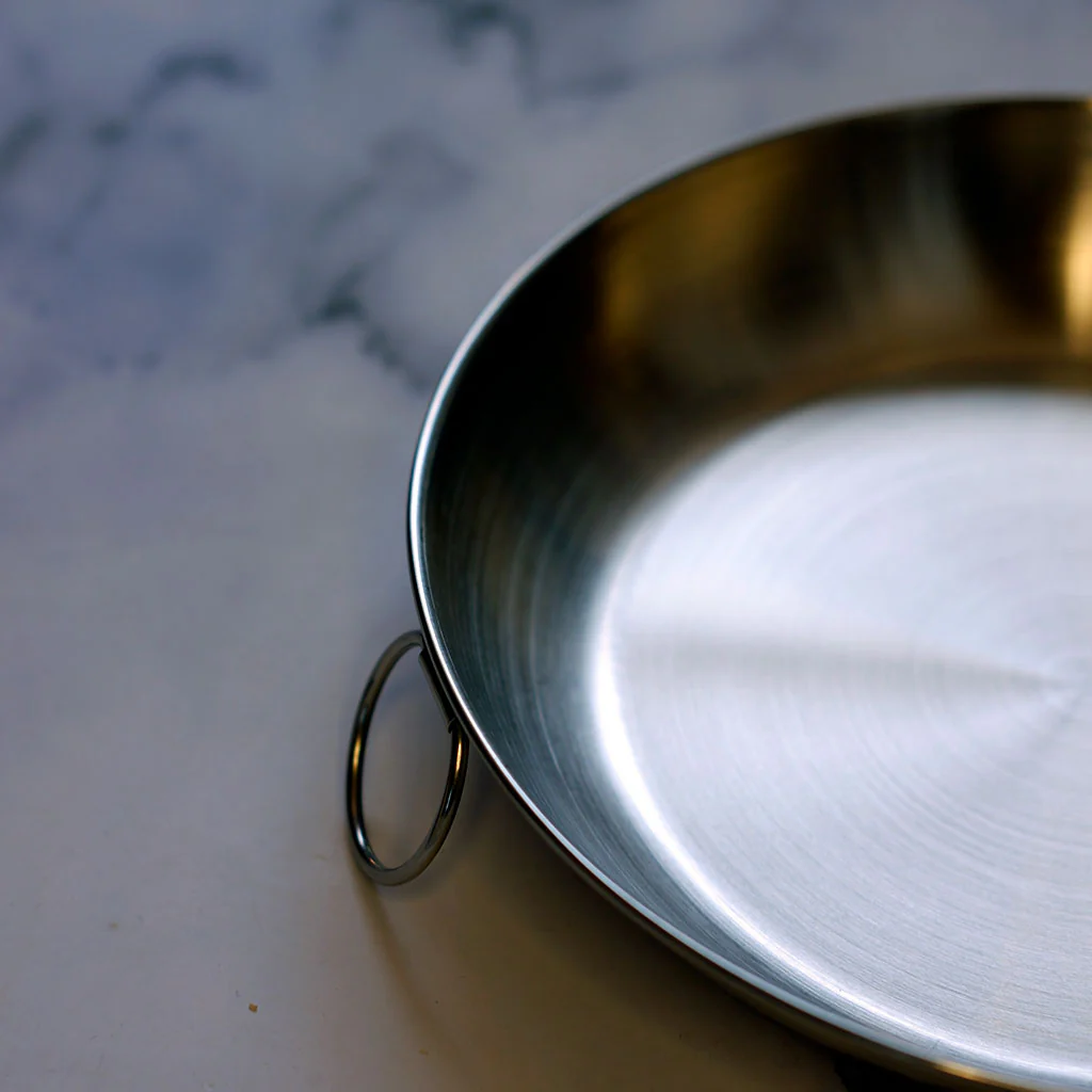 Está fabricado en acero inoxidable pulido, es un plato de lo más tradicional y campero. Por su estructura, es muy robusto, y es apto incluso para poner directamente a la barbacoa para calentarte la comida.
