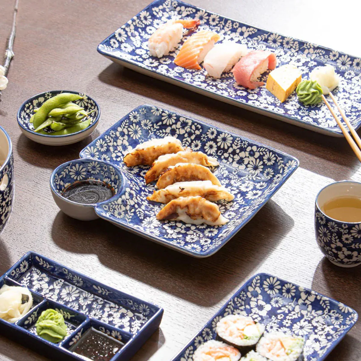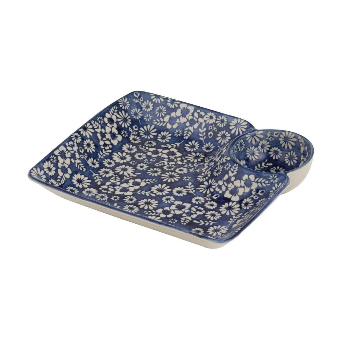 Fabricado con gres de primera calidad, este plato de gres con salsera Hana Ladelle cuenta con un bonito estampado floral en tonalidad azul. Puedes utilizarlo para servir delicioso sushi casero acompañado de su salsita de soja o, si en casa no os gusta la comida oriental, puedes utilizarla para llevar patatas con su salsa brava o fingers de pollo con su salsa de mostaza.