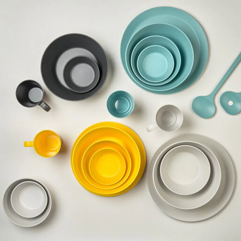 Los platos de resina Bloom de Mepal están disponibles en tres colores con un acabado moteado en tono mate, que se inspira en los guijarros moldeados por el agua y el viento, y se presentan en dos formatos: