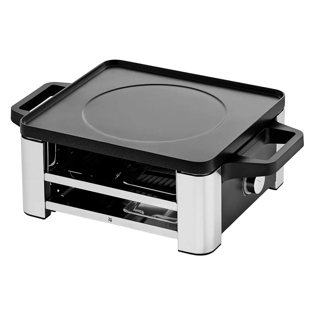 Compacta, elegante, funcional y muy versátil, la Raclette para cuatro WMF te va a encantar. Está diseñada con todo lujo de detalles, para que puedas disfrutar del delicioso queso raclette fundido en las sartenes, acompañado de unas verduras, carnes o pescados, cocinados en el grill, o en la plancha, ¡porque la placa es reversible! Tanto las sartenes como la placa son antiadherentes, por lo que no se pega nada, para que tu única preocupación sea con qué combinar el queso.
