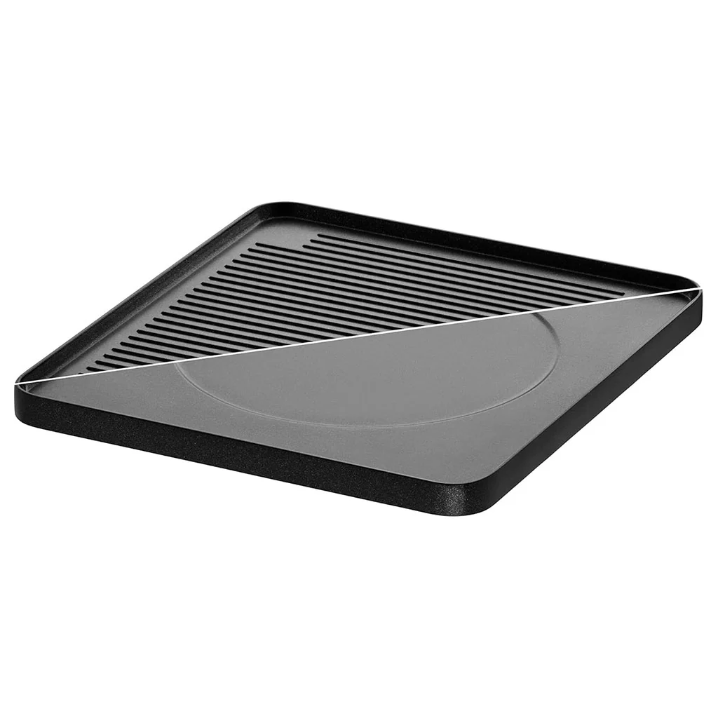 - Placa superior antiadherente y reversible. Una cara con superficie lisa y otra con superficie grill.
