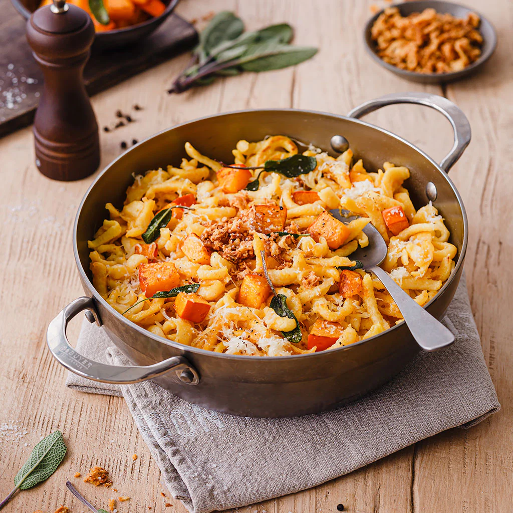 La sartén alta de hierro cuenta con dos asas de acero inoxidable, elegantes y robustas, que te permiten manejarla con comodidad y seguridad, tanto en el fuego como en el horno. Gracias a su gran altura y capacidad, es una sartén muy versátil en la que podrás preparar todo tipo de platos: