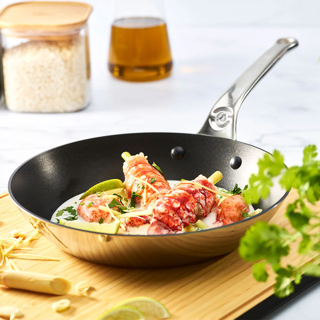 Así, mientras esa capa exterior multicapa de acero te permite un control de temperatura increíble y momentáneo en toda la sartén (paredes incluidas), la capa de antiadherente interior facilita la cocción, ayudándote a cocinar sin que los alimentos se peguen.