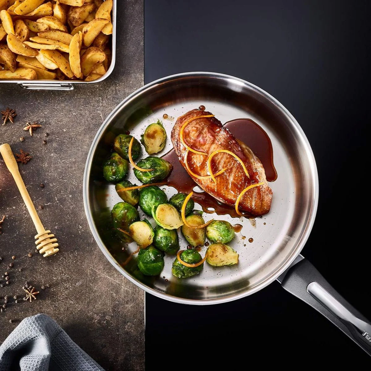 La sartén Emotion de Tefal demuestra lo que una sartén de acero inoxidable de calidad puede aportar en cocina diaria: precisión, sabor y una textura perfecta. Fabricada en acero inoxidable 18/10, sin recubrimiento antiadherente, esta sartén está pensada para quienes disfrutan de cocinar con control, sellando, dorando y desglasando para crear platos llenos de carácter.