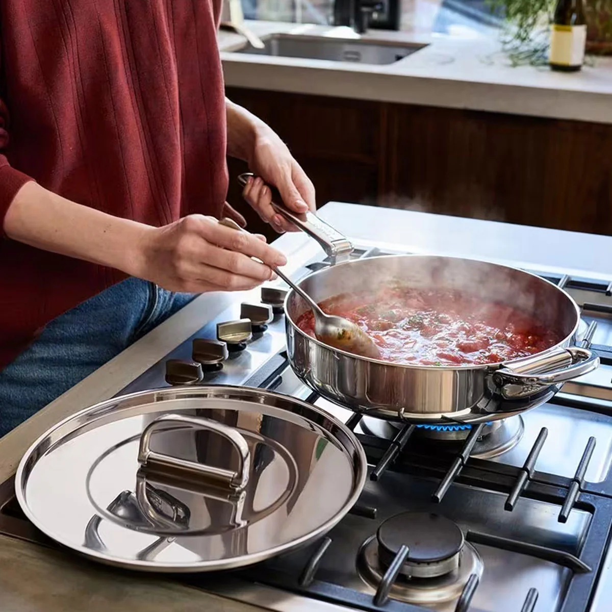 - Sus paredes altas y rectas, que proporcionan una gran versatilidad. Con su interior de inox sin revestimiento, es una sartén ideal para freír, saltear, dorar o marcar cualquier alimento. Pero su diseño de sauté hace de ella una cacerola baja estupenda, perfecta para preparar todo tipo de guisos caldosos, estofados o platos de pasta, con una enorme eficiencia y aprovechamiento del calor, por su construcción de tres capas.
