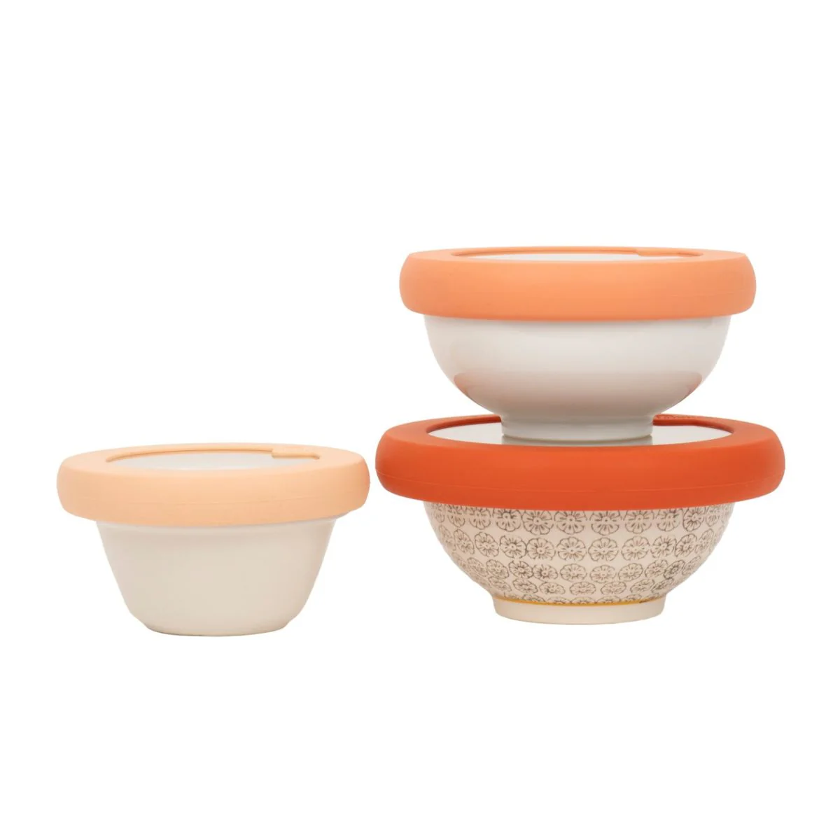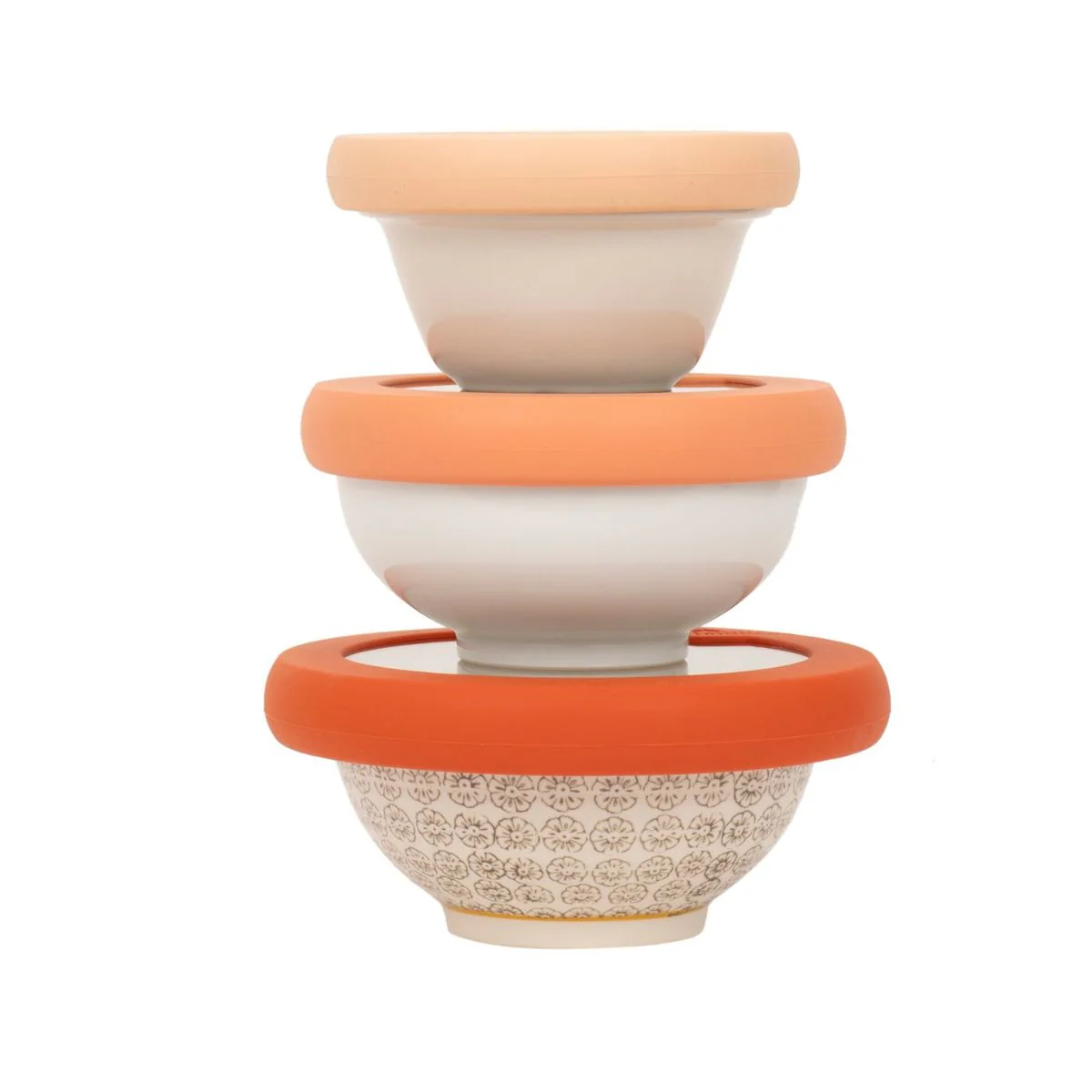 El set incluye 3 tapas circulares apilables entre sí en diferentes tamaños, disponibles también en dos colores, Terra Cotta y Gradual Green: