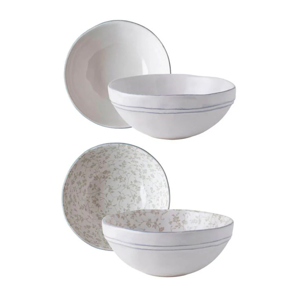- 2 cuencos con el exterior blanco con líneas grises y sutiles flores estampadas en su interior.