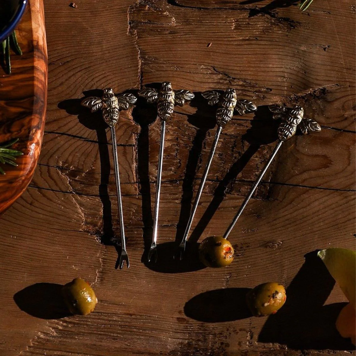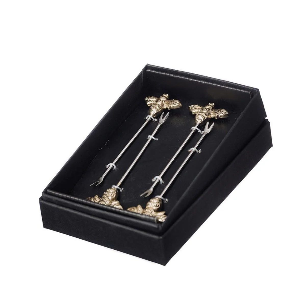 El Set de 4 pinchos para aperitivos de acero inoxidable Selbrae es un encantador y funcional juego de 4 palillos de inox con los que pincharás sin problemas las aceitunas del picoteo. Fabricado en Escocia, su diseño destaca por la preciosa y detallada figura de una abeja dorada de cada pincho. Además de ser unos pinchos preciosos, son muy eficaces gracias a la doble punta de su extremo, que no solo se clava sin problemas en las olivas, sino que también es ideal para los caracoles y el marisco.