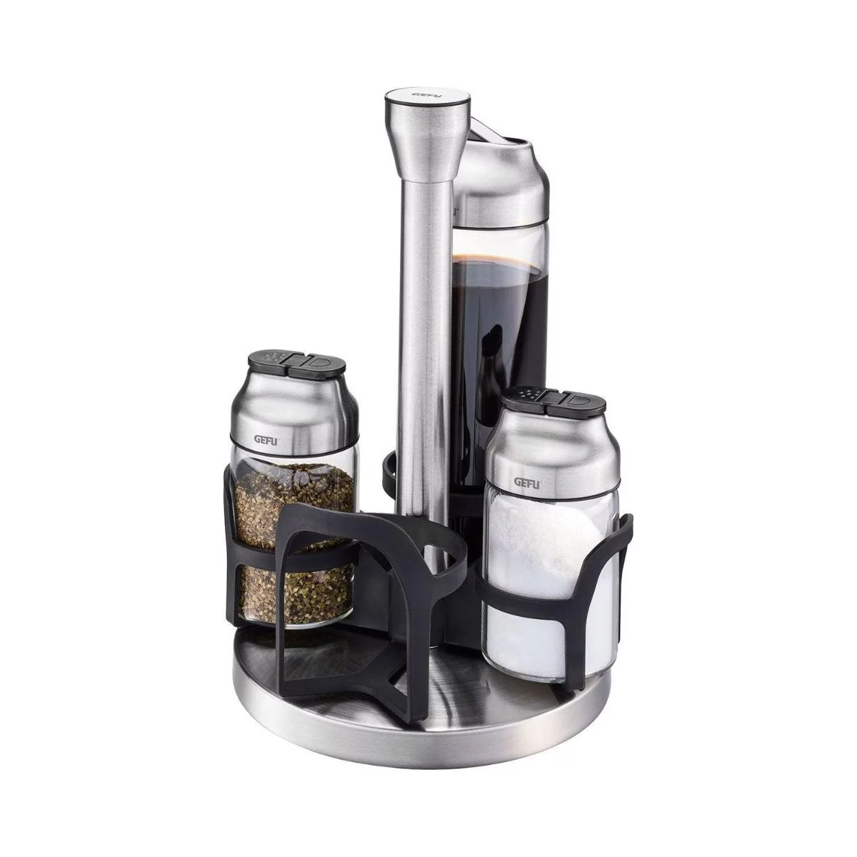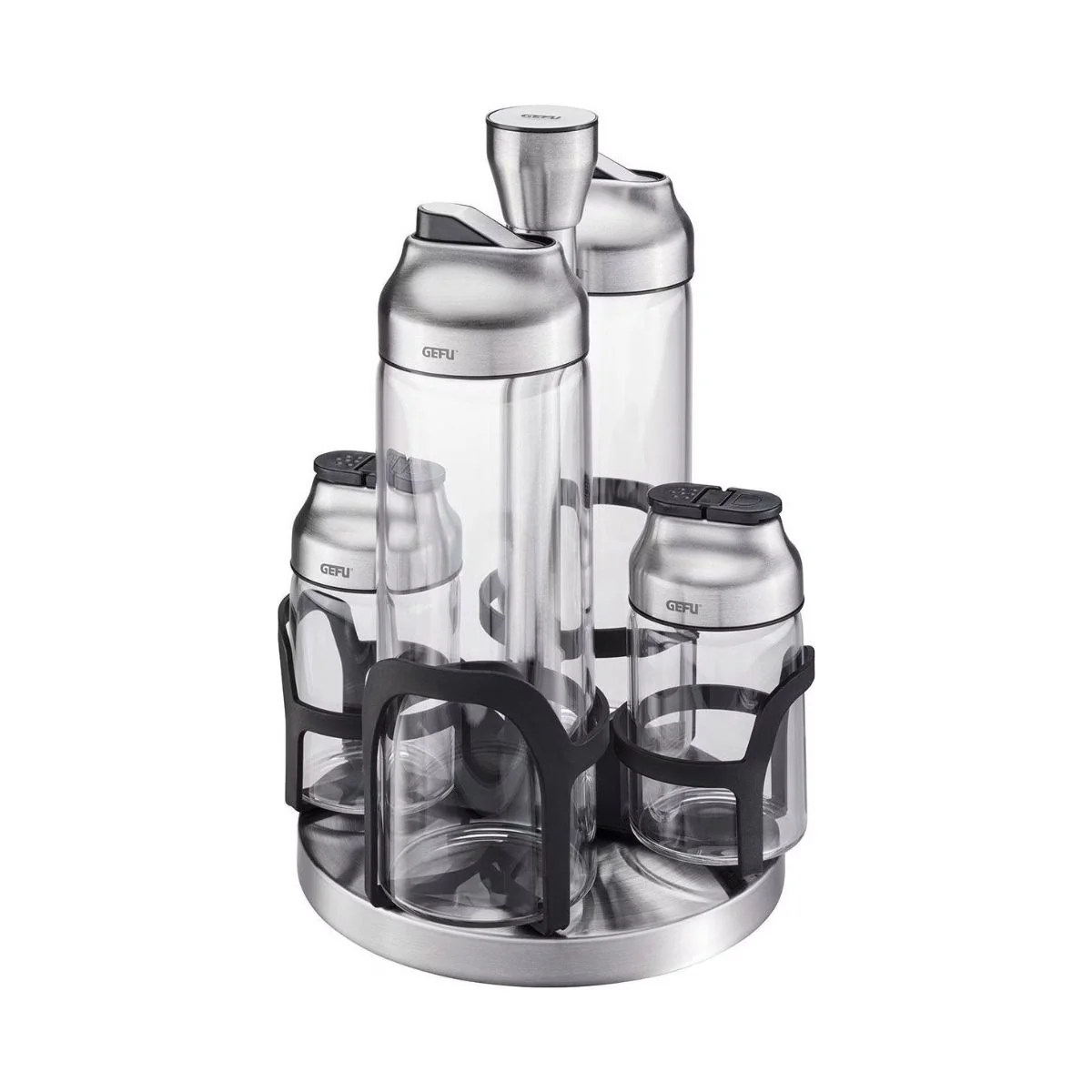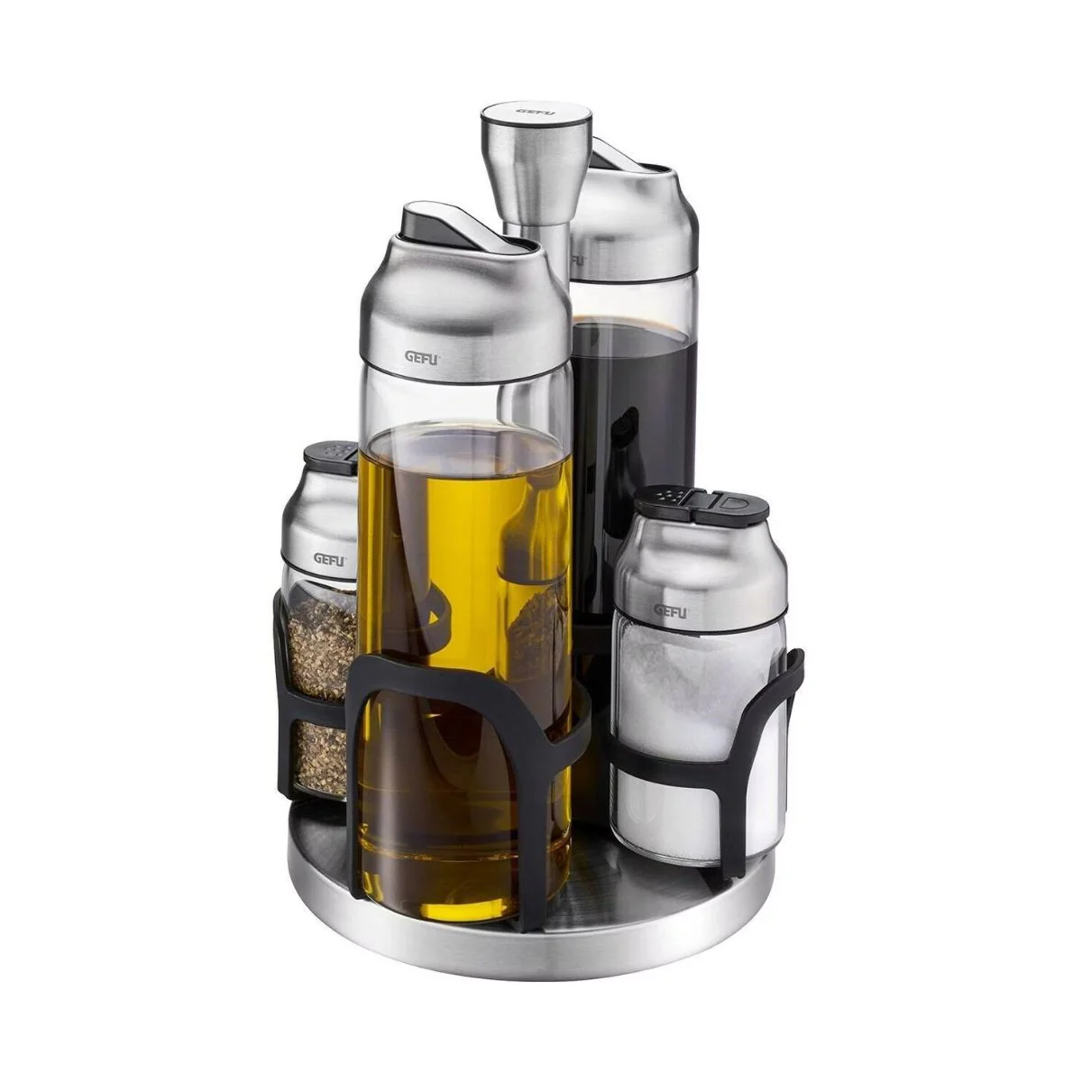 Organiza, sirve y aliña sin esfuerzo con el Set de aceitera, vinagrera y especieros Kippo Gefu. Su práctico carrusel giratorio mantiene todo perfectamente ordenado y siempre a mano, para que puedas condimentar y dar el toque final a tus platos con total comodidad.