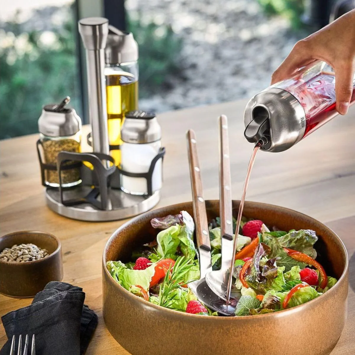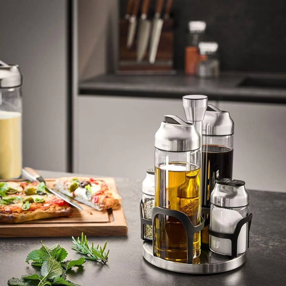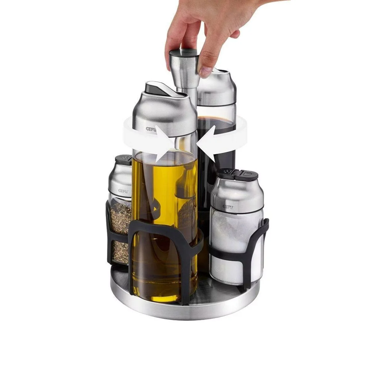 Organiza, sirve y aliña sin esfuerzo con el Set de aceitera, vinagrera y especieros Kippo Gefu. Su práctico carrusel giratorio mantiene todo perfectamente ordenado y siempre a mano, para que puedas condimentar y dar el toque final a tus platos con total comodidad.