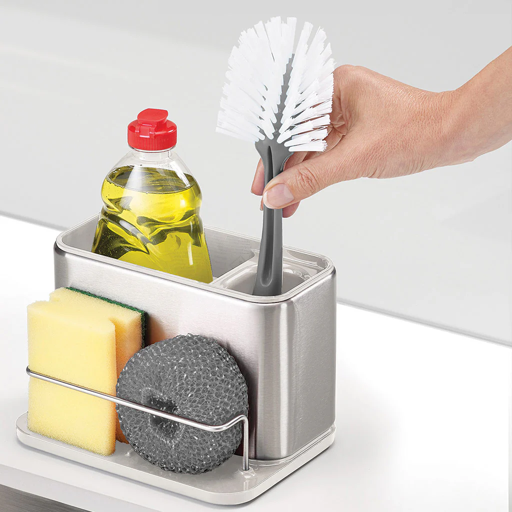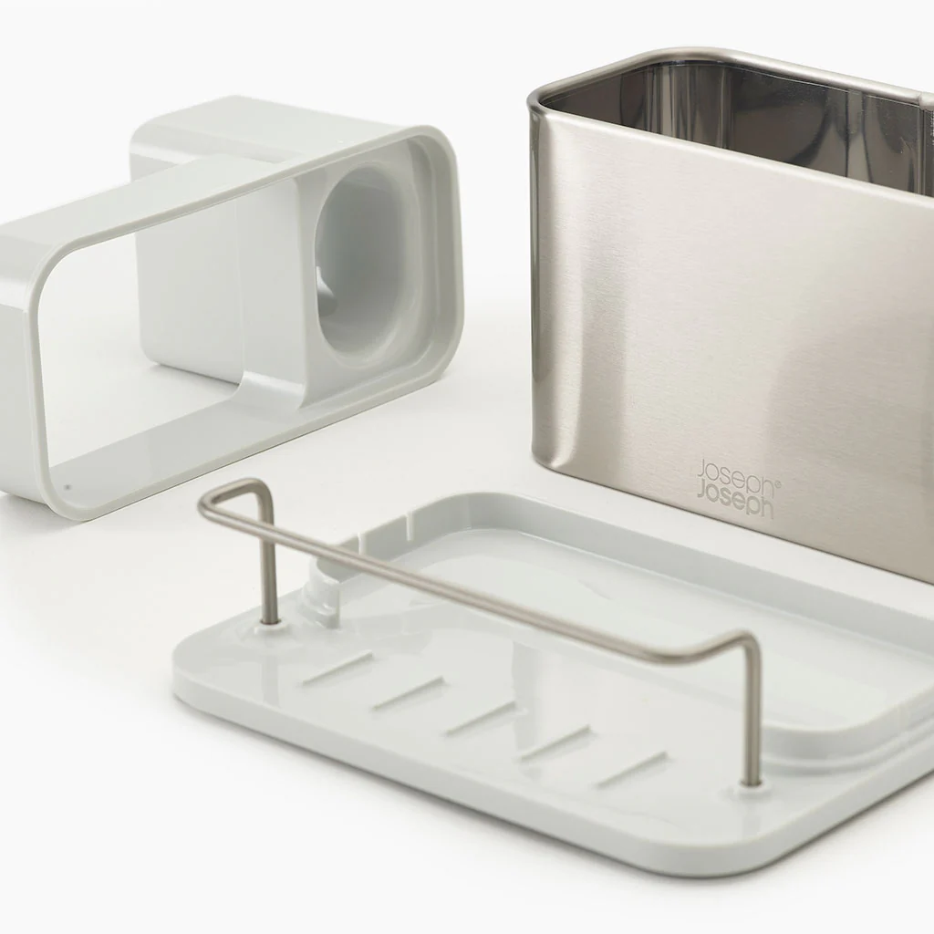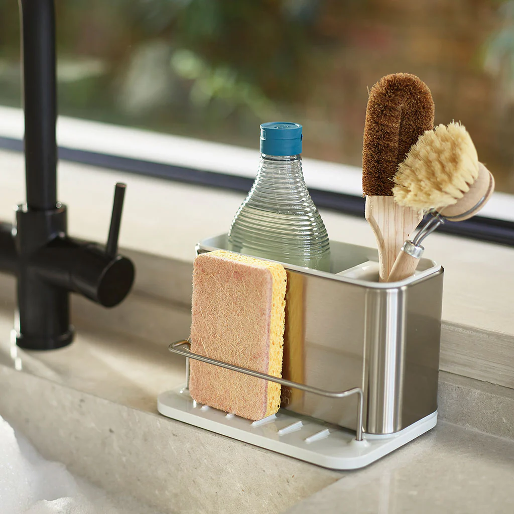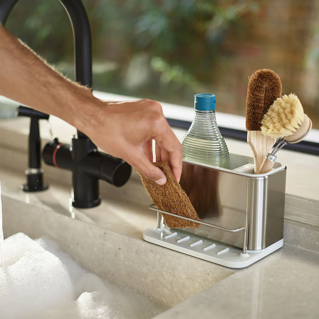 Ideal para mantener el orden en cualquier rincón de la cocina, el Soporte de fregadero de acero inoxidable Surface Joseph Joseph te permitirá tener organizado todo lo que necesitas para fregar los platos, cazuelas, sartenes y ollas. El soporte cuenta con un compartimento de dos partes, perfecto para colocar de forma recogida y por separado la botella de jabón y los cepillos de limpieza. En el exterior podrás dejar las esponjas y los estropajos húmedos, que no se moverán gracias a la barra de sujeción lateral.